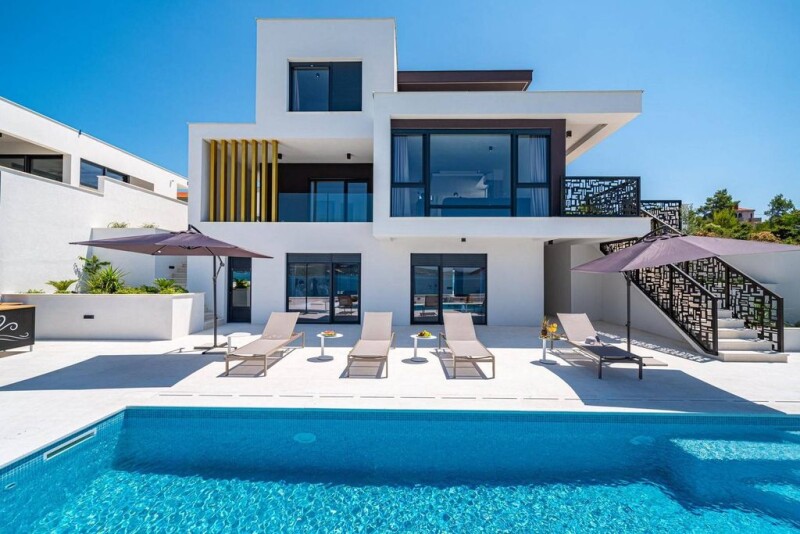 Located in the alluring waterfront setting in the Zadar area, the splendid villa Sealine offers the most extraordinary blend of contemporary architecture and unique natural surroundings. The exclusive seafront position of the villa allows you to enjoy the sweeping views of the pristine Adriatic and islands that will not leave you indifferent. The city of Zadar delights with many historic sights, famous tourist attractions, and many entertainment facilities. Villa Sealine is set on a 680 square meter plot and comprises a living area of 350 square meters elegantly spread over three levels. The villa benefits from a recent construction date and boasts modern interior design highlighted by carefully chosen statement-furniture. Fitted with high-end equipment, this striking villa represents a synonym for extraordinary living. The open-plan living area comprises a fully-fitted kitchen, lovely dining room, a toilet, and cozy living room overlooking the crystal clear sea and spacious poolside terrace. Large glass windows slide open to enhance the indoor/outdoor Mediterranean lifestyle. Offering the highest comfort level and utmost privacy, each of five comfortable double bedrooms has a private bathroom area. Designed with great attention to every detail, the outdoor areas assure a relaxing ambiance throughout the year. Located only steps away from the sea, the attractive pool and sunbathing area offer unique views, especially dramatic at sunset. There is also a sauna and an outdoor poolside bar for the ultimate relaxation by the pool or unforgettable summer nights al fresco. Parking spaces in the garage are also available. The nearest airport is only 25 kilometers away, and Zadar, with its UNESCO inscribed sights, is only 35 kilometers away. This region is widely known for renowned Paklenica National Park (Croatia’s second oldest national park), less than an hour drive away. Villa Sealine is a genuinely exquisite property, ideal for admirers of the Mediterranean lifestyle who want to enjoy an enchanting natural ambiance without compromising quality or comfort.