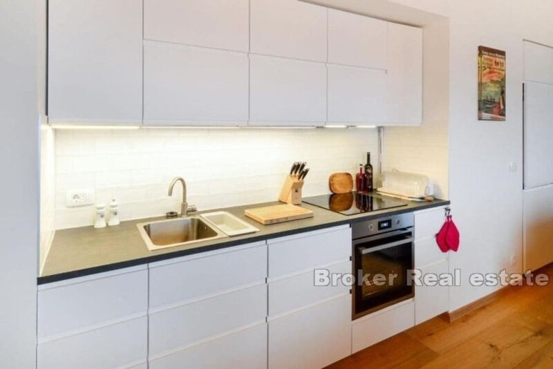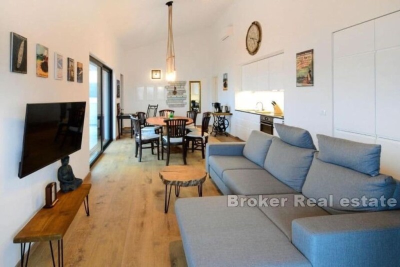 Apartment house in 3th row with 2 pools and great sea view; Trogir area. Excellent apartment house in 3th row nearby Trogir; house have 3 floors with 3 apts and 2 pools ( 35sqm and 15sqm) each with sundeck, built in 2020, 500 m from the centre, in a quiet, sunny position, 100 m from the sea, 100 m from the beach. Excellent sea view from all positions, complitely furnished! Plot size 745sqm, total property size 298sqm + garage for 2 cars + parking for 3 cars. Property also includes semmiattached house of 70sqm with apartment in it. In courtyard: swimming pool angular (8 x 4 m, depth 150 cm) with internal staircase and salt-electrolysis pool-cleaning system. Swimming pool with hydromassage.Outdoor shower. Each floor have two bedroom apartment of: 78 m2 ground fl, 78sqm 1st fl and 72sqm 2nd fl. Modern furnishings: living/dining room with satellite TV (flat screen), air conditioning. Exit to the balcony. 1 bedroom with 1 french bed (180 cm, length 200 cm), shower/WC, double hand-basin and air conditioning. Exit to the balcony. 2nd bedroom with 2 beds (90 cm, length 200 cm), shower/WC, double hand-basin and air conditioning. Exit to the balcony. Open kitchen (oven, dishwasher, 4 ceramic glass hob hotplates, toaster, kettle, freezer, electric coffee machine). Air-conditioning, forced-air heating. Balcony 30 m2. Balcony furniture. Marvellous panoramic view of the sea.
