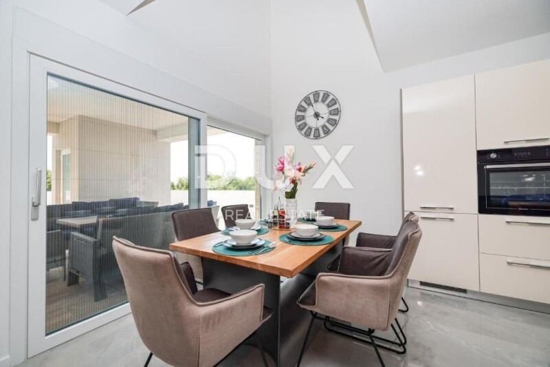 NIN - newly built villa in a quiet location A new modern villa with a swimming pool and sauna for sale, located in a peaceful natural environment In a beautiful natural setting, this newly built modern villa, two floors, represents a combination of luxury, functionality and comfort. Located in a peaceful environment, it is ideal for relaxing and enjoying privacy, away from the hustle and bustle of the city. The yard is designed for easy maintenance and offers the perfect place for relaxation and socializing. The pool is surrounded by a sunbathing area and the yard is equipped with an outdoor toilet, shower and storage and certainly ensures ultimate enjoyment during warm days. Also, preparations have been made for installing a jacuzzi, providing additional opportunities for relaxation. The villa spreads over two floors and is designed according to modern standards: The ground floor of this villa is designed as a comfortable and spacious living area. The kitchen, dining room and living room are connected in an open-space concept, with access to a covered terrace that is ideal for relaxing and enjoying the outdoors. In addition to the main bathroom, the ground floor also offers an outdoor guest toilet and practical storage for organizing household items. On the first floor there are three bedrooms, each with its own bathroom. The rooms are decorated to provide maximum comfort and privacy, making them the perfect place to relax. This luxury villa was built according to high construction standards and equipped with top quality materials. External PVC carpentry with three-layer glass, electric blinds and mosquito nets provide additional security and comfort. The heating system includes floor heating and Inverter air conditioners, ensuring an optimal temperature throughout the year. This property represents the perfect combination of modern design, quality and natural surroundings. **** Dear clients, the agency commission is charged in accordance with the General Business Conditions www.dux-nekretnine.hr/opci-uvjeti-poslovanja Lejla Jajčanin Agent s licencom E- www.dux-dalmacija.com House Nin, 157m2.