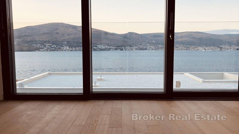 A villa with a swimming pool and open sea view is for sale. It is a property located on the island of Čiovo. The villa is located on land with a total size of 697 m2 and its living area is 315 m2. There are three bedrooms on the ground floor, each of which has its own bathroom. Each of the bedrooms has direct access to the sunny terrace located on the ground floor. On the second floor, the first floor, there is another bedroom and bathroom, dining room and living room. The dining area has a total of 63 m2 and is glazed on both sides, with an open kitchen. The living room has direct access to a spacious terrace equipped with an outdoor dining area and a large heated swimming pool. The highest quality materials were used in the construction of this villa. A well-thought-out concept of greenery with enchanting lighting completes the modern architecture of the building. The villa was built in 2021. It is only 100 m away from the sea.