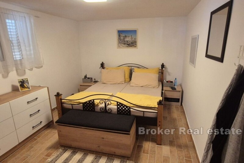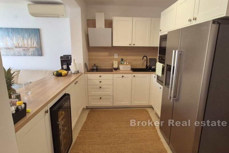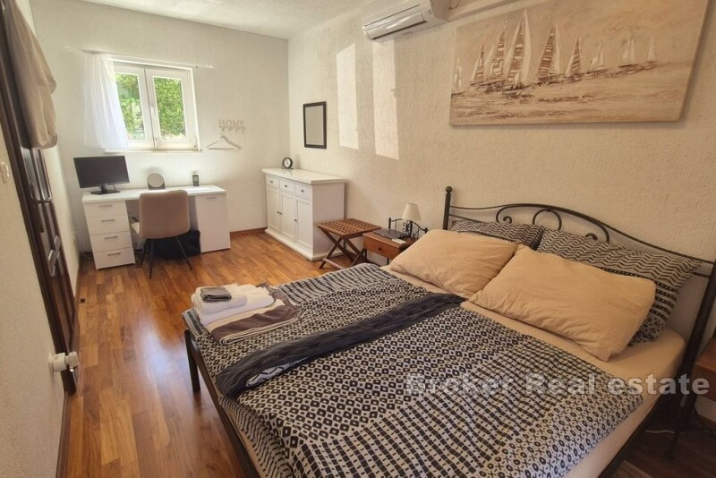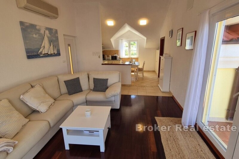 This house is located first row to the sea, right next to the beach, in a quiet place. It is surrounded by a garden area of 345 m2, which includes a jacuzzi, an ideal place for relaxation. The house consists of three apartments with a total net living area of 226.76 m2. The apartment on the ground floor has two bedrooms, a kitchen, a living room, a bathroom, a dining room and a covered terrace. The apartment on the first floor includes a living room, kitchen, corridor, staircase, bathroom, three bedrooms and a covered terrace. The apartment on the second floor consists of a living room, a kitchen, a dining room, two bathrooms, a hallway, three bedrooms, an external staircase and an uncovered terrace. The house also has three parking spaces available, providing enough space for tenants or guests. The property is ideal as a holiday home or for a year-round stay. It also represents an excellent business investment for tourism. There is also an airport nearby, which adds to the attractiveness of the location.