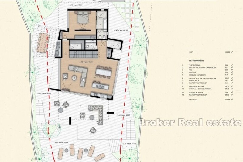 Modern villa located on elevated ground. The property is located in Vodice on a plot of land with a slight slope, which offers the villa an exceptional sea view. The villa with a living area of 391 m2 is located on a plot of 740 m2 and was built in a complex with two other villas that have a common access road but separate garages and entrances. The property consists of 3 floors, basement, ground floor and first floor. In the basement there is an engine room and laundry room, dressing room and storage room, as well as wellness and spa areas with jacuzzi, sauna and shower. On the ground floor there is a kitchen, dining room, living room, shared toilet and pantry and a bedroom with private bathroom and dressing room. All rooms on the ground floor have direct access to the terrace which is partly covered and has access to the summer kitchen and pool, while the bedroom has its own exit to the covered terrace. On the first floor there are three more bedrooms, each with its own bathroom and dressing room and access to a loggia or terrace. The construction of the villa used the highest quality materials with built-in smart systems throughout the property. The heating and cooling system in the villas will be provided with air conditioners and underfloor heating. Also, the price of the property includes 4 parking spaces in your own garage with a separate entrance separated from the other two villas. Due to its location and superb view that cannot be covered precisely because of the slope on which it is located, the property is ideal for tourism or for personal use throughout the year. The villas have complete security and privacy with plants that border the property on all sides. In addition to this property, there are two other villas that you can find under numbers 2043/27 and 2043/28.