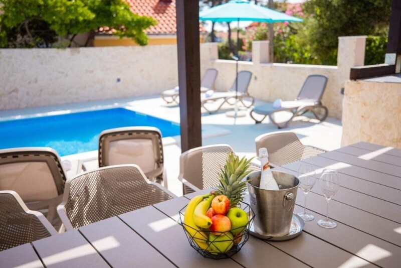 Location: Vir Built: 2021 City center: 0.5 km Sea: 0.35 km Airport distance: 35 km Inside space: 280 m2 Plot size: 716 m2 Bedrooms: 5 Bathrooms: 4 Swimming pool: 26 m2 Parking: 3 Air-conditioner Gym Sauna Cameras Patio Playground Garden.