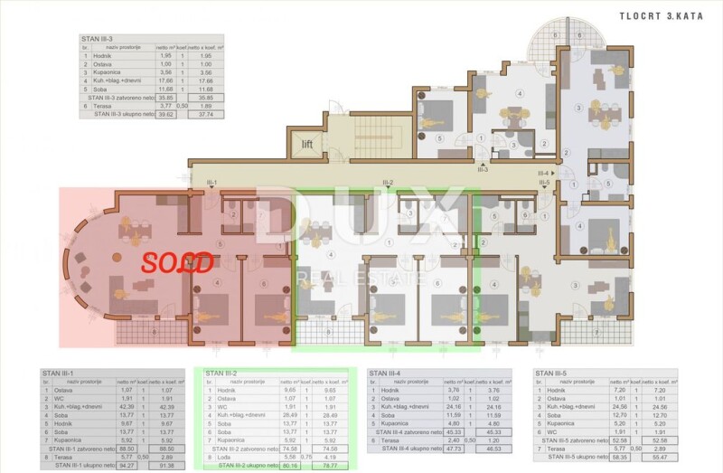 ISTRIA, PULA - Not far from the city center and the famous Veruda, there is a quality new building in a quiet street. We are proud to present a new construction project located in an interesting location in the city of Pula. Namely, the building is located only a 3-minute drive from the city center, and it is also only a 5-minute drive from the famous tourist resort of Verudela. The building is positioned in a quiet location, without a lot of traffic in the vicinity of its contents necessary for everyday life. The building consists of several residential units that extend from the ground floor of the building to the 3rd floor. Next to the building, there are parking spaces in the garden of the building, as well as in the building's garage, while future apartment owners have the option of choosing a parking space for their tin pets. DESCRIPTION OF THE APARTMENT; Thus, in this building, we are proud to present an apartment on the 3rd floor, which consists of a total of 78.77m2 NET usable area. The apartment is organized so that the entrance to the apartment has a corridor that separates the apartment space into a private space and a space for daily life and entertainment. Thus, in the private area of the apartment there are 2 spacious bedrooms, one larger bathroom and a smaller storage room. There is a guest toilet along the corridor next to the entrance to the apartment. The space for daily life is designed as a larger "open space" space, and there is a spacious kitchen, a comfortable dining room and a larger living room. This entire space is flooded with natural light that penetrates into the apartment through large glass walls. From the living room there is an exit to the outdoor terrace. * Customers have the opportunity to choose to buy a parking space, either in the building's garden or in the building's garden; - Parking lot in the building's garden; €7,850.00 - Parking in the garden depending on the square footage: from €20,520.00 to €46,760.00 - Storage room depending on the square footage; from €9,870.00 to €13,250.00 TECHNICAL AND ADDITIONAL DATA; * Each apartment in the building will be equipped with electric underfloor heating * High-quality PVC joinery will be installed * Facade insulation 10 cm * The building has an elevator that connects the garage to each floor of the building * High-quality ceramics will be installed on the floors (for now, customers have the option of influencing !) * The possibility of moving in is planned for the beginning of 2025 LOCATION DESCRIPTION; The building is located in a quiet location in the city of Pula, only a 3-minute drive from the city center, and only a 5-minute drive from the famous tourist resort known as Verudela. On Verudela you can find a large number of rocky and stony beaches with crystal clear sea, and in the immediate vicinity of the building there are numerous restaurants, cafes, as well as a market, next to the building there is also a small shop, as well as everything you need for a safe and peaceful everyday life of modern man. In short, this is a property worthy of your attention, which can serve as an ideal option for a private investment or as an option for a real family home. For any additional questions, necessary information or wishes to organize an appointment to view the location and the current construction status, feel free to contact us! Dear clients, the agency commission is charged in accordance with the General Business Conditions: www.dux-nekretnine.hr/opci-uvjeti-poslovanja Loren Kečan Agent s licencom E- www.dux-istra.com ISTRIA, PULA - 2BR+DB apartment on the 3rd floor of a new building.