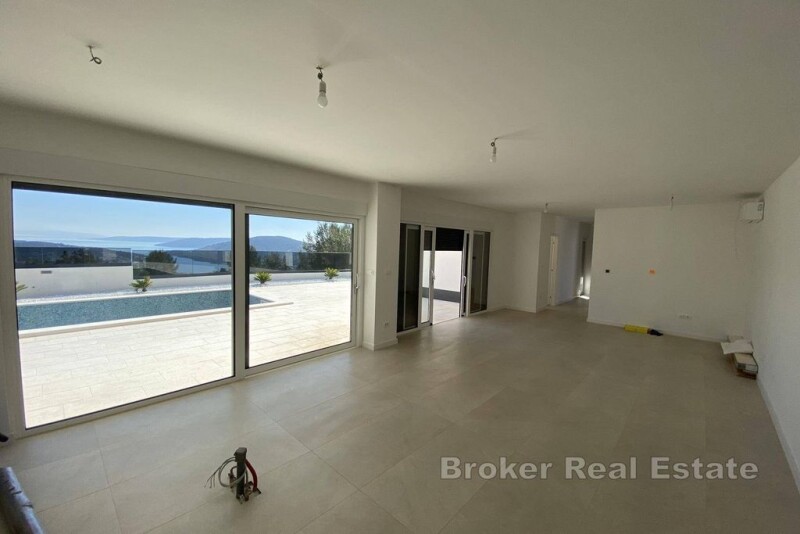 Each of the villas consists of a ground floor and an upper floor, with a total net living area of approx. 200m2, and is built on a plot of land of 550-600m2. On the ground floor there is the main entrance, a living room with a dining room, a kitchen, a bedroom with its own bathroom, an additional guest toilet, an exit to a beautiful terrace with a swimming pool and a beautiful view of the sea, as well as a summer kitchen and a sun deck. On the first floor there are 3 additional bedrooms, each with its own bathroom, storage/wardrobe, and two covered terraces with an enchanting view of the sea and nature. Access to the villas with a car is direct, and there is a private parking lot for a minimum of 2 cars in the fenced yard. The complex is located at a distance of approximately 1.4 km from the sea and the center of the village, 20 km from the city of Trogir, and 25 km from Split airport.