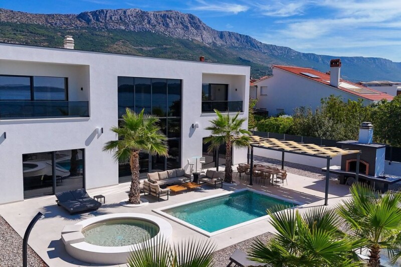 Villa Vista Mare is an epitome of elegance and modern luxury set against the stunning backdrop of the Adriatic Sea. This seafront villa is perfectly nestled in the charming town of Kaštela, between the renowned tourist destinations of Split, Trogir, and Šibenik, offering a harmonious escape. With its contemporary design and prime location, Villa Vista Mare offers unparalleled luxury, comfort, and breathtaking views. Spanning an expansive 450 m2 over two meticulously designed floors, Villa Vista Mare sits gracefully on a 1200 m2 plot. The villa’s architecture harmonizes modern sophistication with natural beauty, featuring large glass walls that seamlessly integrate the indoor and outdoor living spaces. Upon entering the ground floor, you are greeted by an open-plan living area that exudes elegance and warmth. The spacious living room, dining area, and fully equipped modern kitchen are bathed in natural light, thanks to the floor-to-ceiling windows that frame the spectacular sea views. This design enhances the villa’s aesthetic appeal and ensures you are always connected to the stunning outdoors. The ground floor also houses a luxurious master bedroom with a private bathroom and a walk-in closet. This floor also includes a fitness room, a technical room, a guest toilet, and a garage. The first floor features four elegantly appointed en-suite bedrooms designed to provide maximum comfort and privacy. One of the villa’s most captivating features is its outdoor area. Step outside to discover a beautifully landscaped terrace featuring a swimming pool, a relaxing whirlpool, and a sunbathing area that commands an inspiring view of the Adriatic Sea. The terrace also includes a well-equipped barbecue and dining area, perfect for al fresco meals while savoring the stunning sunsets. Villa Vista Mare boasts direct access to a pristine beach, allowing you to enjoy the Adriatic’s crystal-clear sea. The property is fully fenced for privacy and security, equipped with an electric fence, and offers ample parking for several vehicles. Whether you seek a serene retreat or a luxurious residence, Villa Vista Mare promises an unmatched Mediterranean experience. With its perfect blend of modern design, exceptional amenities, and a prime seafront location, this villa is an idyllic sanctuary for those who cherish peace and elegance in a beautiful setting.
