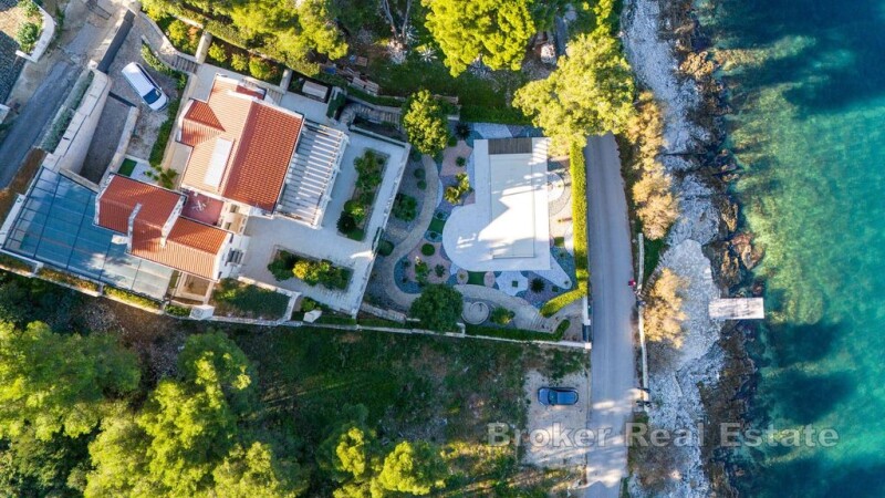 For sale is a beautiful stone villa with a total living area of 980 m2 on the island of Čiovo on a plot of land of 1370 m2. This special property is built of Brac stone and extends over a total of three floors. On the ground floor, there is a laundry room, a wine cellar and a wardrobe. Furthermore, on the ground floor there is a bedroom with a bathroom and a terrace, a kitchen with a dining room and a living room, as well as a spa area with a smaller indoor pool and a Russian sauna. On the second floor there is a bedroom with its own bathroom, a kitchen with a dining room and a living room, as well as a large terrace. On the third floor there is a spacious bedroom with its own bathroom, and two smaller rooms also with their own bathrooms. On the third floor there is a large terrace with a view of the sea. The property also has an apartment with a separate entrance, which consists of a bathroom, bedroom, kitchen and living room. The grounds of the villa consist of an outdoor heated pool and well-maintained Mediterranean plants. The offer of this beautiful villa includes central heating, solar panels, video surveillance and a water and air purification system. The property has 3 parking spaces and a garage for three cars is located on the ground floor of the house. It is only 10 meters from the sea and 8 km from the center of Trogir by air. Split Airport is 7 km away by air. It is a rarely seen luxury on the market that, in addition to a unique location, also offers a certain amount of glamorous property that can be enjoyed every day.