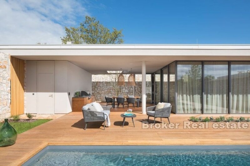 A luxurious newly built house with a swimming pool located in a quiet Istrian village not far from Pula. This one-story villa was built in 2022, its living area is 143 m2 and it is spread over a plot of 1000 m2. It consists of an entrance hall, kitchen and dining room, two bedrooms, a sauna, a bathroom, a toilet, a storage room and a spacious living room that opens onto a terrace with an outdoor kitchen and barbecue and a comfortable area for relaxing by the pool. In the yard there is a swimming pool of 36 m2 and three parking spaces. The villa is fully equipped with the highest quality materials. Modern design, a quiet location that provides complete enjoyment of privacy and the proximity of all the necessary facilities for life make this property an excellent choice for both tourism and year-round living.