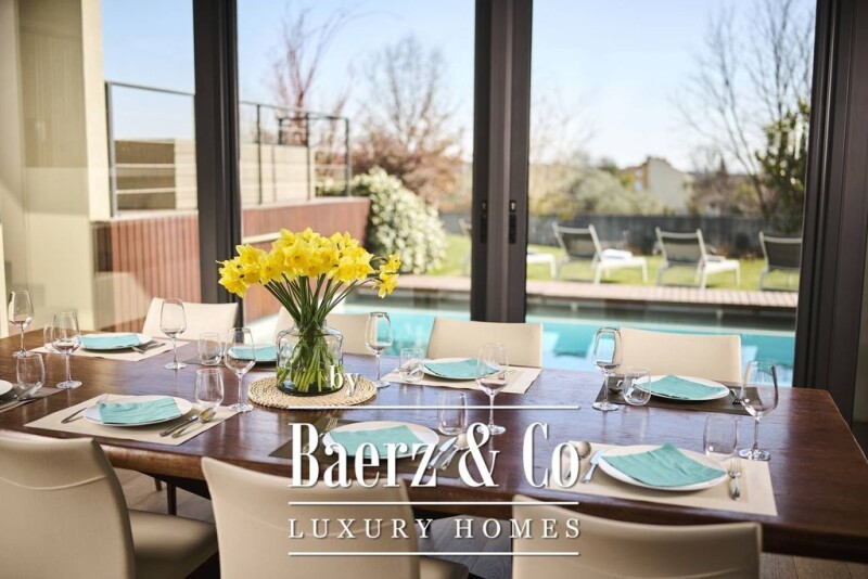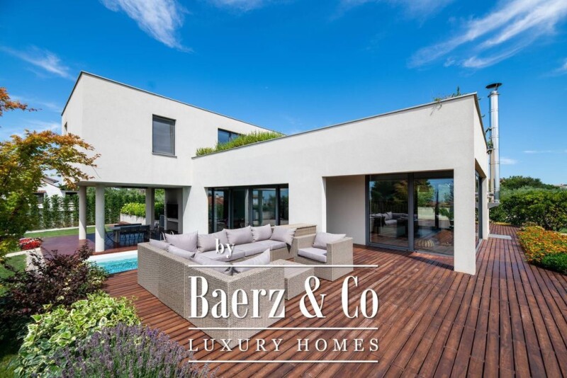 Modern smart house with 4.956 m2 land surrounded by olive groves just 400 meters from the favorite beaches of Umag. The architecture merges elegant design and stone as a traditional building element into an attractive villa with pool that provides the highest standards of modern living. The main entrance and driveway to the building are located on its west side, on the existing street, and the space for a garage with storage and a multimedia hall in the basement of the building. The ground floor consists of an entrance hall on the west side, a guest room with bathroom on the north side of the building and a unique living room, kitchen and dining room which is connected to the south facing terrace facing the sea, and north to the garden and outdoor terrace. In the entrance area, which is accessed west through the windshield, there is a garden on the north side of the house. The guest room is connected to the entrance area via an entrance hall from which one enters the bathroom. In the western part of the building, in addition to the mentioned windshield, there is a toilet to the north, and to the south there is an economic space related to the kitchen. On the west side of the south terrace, connected to the kitchen and the economic part, there is a summer kitchen covered with the volume of the upper floor. A staircase that is visible from the living room leads to the upper floor. It contains three bedrooms with bathrooms, a dressing room on the west side of the house and a common entrance hall. The roof of the living room is partly a passable fenced terrace, and partly a green roof. The roof above the first floor is a flat terrace, and above the living room on the ground floor is a flat walk-through terrace combined with a green roof. All windows and exterior doors are aluminum, glazed with IZO glass 4 + 12 + 4 mm. The number of storeys of the building is / P0 + Pr + 1K /, ie the basement, ground floor and first floor with a flat roof, partially passable. The building is fully finished and suitable for use or housing. It is located on a hill surrounded by olive groves. It has an arboretum in its environment on which 70 species of plants have been planted, of which very old olives stand out. In the spacious yard there are parking spaces for 5-6 cars and a garage for 4-5 cars. In this modern construction, attention is paid to quality so that internet cables are routed throughout the house. Modern technology is controlled via mobile phones, so it is a so-called "smart house". Special attention deserves a heated pool 5x9 m2 = 45 m2 which has a shutter that closes. This villa will satisfy the client who is looking for top quality.