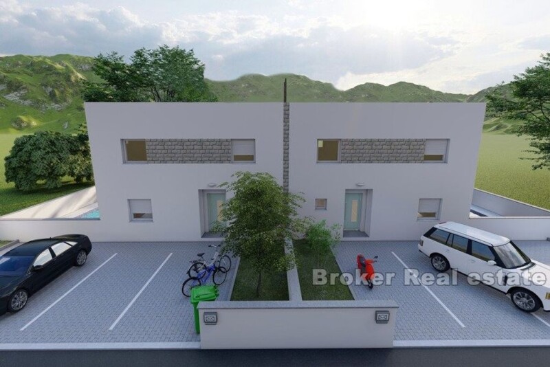 Two luxury villas with pool on the island of Vir, modernly equipped. The villas are currently under construction. The planned completion of the works is expected at the end of 2022. The villas together make one double object with a mirror floor plan, living area of 143m2, located on a plot of 210m2. Luxuriously decorated space is spread over two floors, ground floor and first floor connected by internal stairs. The ground floor has a kitchen with dining area, living room, bathroom, storage room and one bedroom, while the first floor has two bedrooms with private bathroom and storage 8m2, with all necessary connections for washing machine and dryer. Villas have a chimney, air conditioning in each room and underfloor heating. The thickness of the thermal insulation is 10 cm, and it was awarded the A energy certificate. In addition to the excellent equipment of modern decoration, private parking, villas are complemented by two private terraces, each with its own pool. Located in a private oasis of peace, 400m from the sea, and just as far from all necessary facilities. Ideal for a break from the hectic lifestyle. Villas are sold separately.