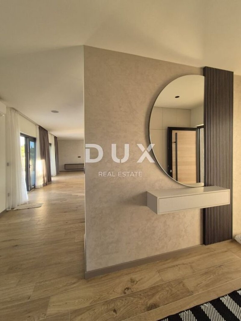 ISTRA ROVINJ - Modern newly built single-storey villa, located in a quiet location without neighbors. We proudly present this high-quality and valuable luxury one-story house, built at the beginning of 2024. It is located in the immediate vicinity of the unmissable town of Rovinj, as well as its facilities necessary for a safe and peaceful life all year round. By visiting the villa, we are sure that you will be charmed by the peace and high level of privacy it provides, as well as the quality of all the work performed. It is a villa worthy of your attention, which represents a perfect family home or an ideal property with a secure return on investment. DESCRIPTION OF THE VILLA: It consists of a total of 291m2 of living space, and every square meter is used to the maximum with a focus on simplicity and maximum comfort. As soon as we enter the villa, we are first greeted by a graceful lobby with a space intended for a wardrobe, which also divides the villa space into a living area and a bedroom, i.e. the private part of the villa. The living space is designed according to the "open space" system, without dividing walls, and where there is a larger and comfortable living room, then a spacious dining room sufficient for the whole family, and a modern and fully equipped kitchen. The space is decorated with custom-made wardrobes and furniture exclusively for this villa, and we are sure that you will be delighted by the direct communication between the interior of the villa and the outside landscaped area of the garden with the help of larger sliding glass walls. Rich amounts of natural light penetrates the space through the same glass walls, which makes the stay in the villa unique. In the more private part of the villa, there is a guest bathroom, as well as three comfortable bedrooms, each of which has its own bathroom and private access to the garden with a pool. DESCRIPTION OF THE GROUND FLOOR; This villa is located on a spacious, landscaped and fenced garden of 1180m2. By accessing the garden through a movable electric gate with sensors, there are 6 comfortable parking spaces for your tin pets, two of which are covered. The central part of the rear part of the garden is occupied by a 32 m2 overflow pool, perfect for entertaining and relaxing after an active day. Next to the pool there is a beach with a sunbathing area, as well as a covered terrace of the villa with a summer kitchen and space for dining furniture. The rest of the garden is decorated in a beautiful Mediterranean style with numerous plants, which make your stay in the open air more pleasant with various colors of flowers and pleasant scents of plants. The entire property is fenced and offers its owners the maximum level of privacy and peace. The villa is thus surrounded by almost untouched nature, without neighbors. ADDITIONAL INFORMATION: This villa was built according to the private wishes and needs of the owner, which means that every detail was taken care of during the construction, as well as during the furnishing of the villa. * Floor heating with a heat pump is installed throughout the villa. * In all rooms, except for the bathrooms, high-quality parquet suitable for underfloor heating has been installed. * The villa is sold partially furnished, with the furniture that is currently inside the villa, which was custom-made exclusively for this villa. * Air conditioners have been installed in each room, as well as a chimney with the option of installing a pellet or wood stove. * The property is in order, the villa has all the necessary documentation, there are no encumbrances. * The plot is surrounded by a concrete wall, next to which cypress trees have been planted, which have the function of maintaining privacy. * The garden has automatic irrigation. * Parking is for 6 cars, and 2 covered parking spaces. ** There is a possibility of buying a house + additional construction and agricultural plots located next to the house, in accordance with the agreement with the owner, which can certainly be interesting to a potential investor.** For any additional questions, required information or wish to organize an appointment to view the villa with its location feel free to contact us at any time. Dear clients, the agency commission is charged in accordance with the General Business Conditions: www.dux-nekretnine.hr/opci-uvjeti-poslovanja Loren Kečan Agent s licencom E- www.dux-istra.com ISTRIA, ROVINJ - Modern single-storey villa surrounded by nature.