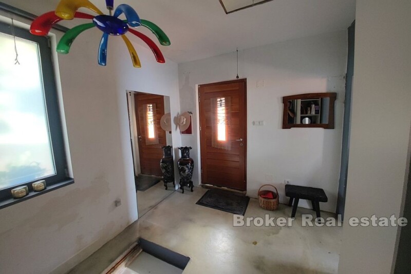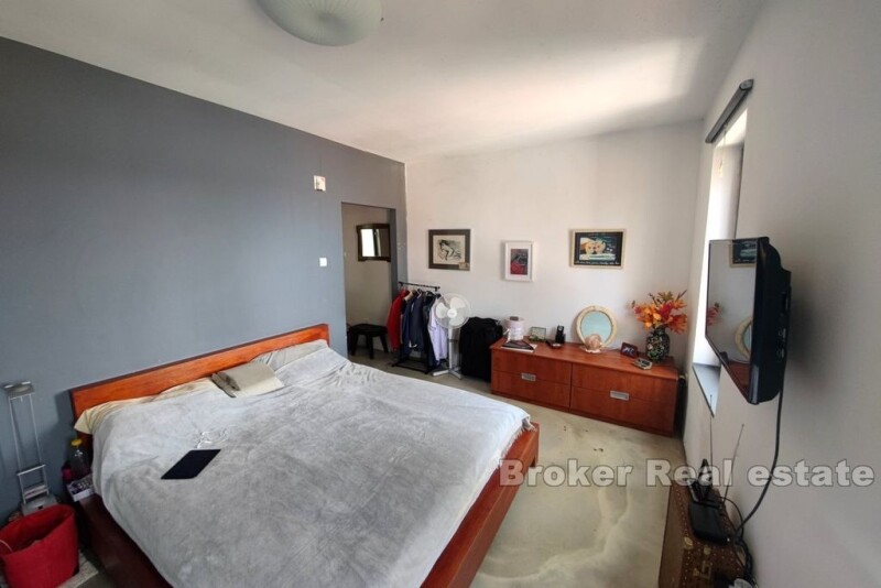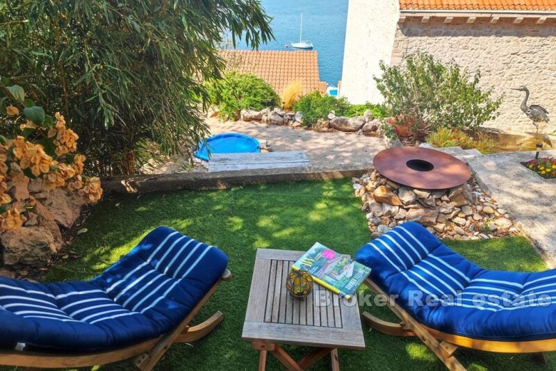 A unique property located in the old part of Šibenik near the fortress of St. Michaelmas. The house is located in an attractive location 70m from the Riva, on a hill with a fenced yard with an open view of the sea. The house itself is of recent construction, spread over two floors that are connected to each other by an internal staircase: – On the ground floor there is a hallway, a bathroom, a storage room, a study and a living room with a kitchen and a dining room that has direct communication with the outdoor terrace and the entire yard. – On the first floor there is an entrance hall, a toilet, a large double bedroom and an additional room with a separate entrance where all the installations for conversion into a smaller guest apartment have been carried out. In the yard there is a summer kitchen and plenty of corners for dining and resting. Cultivated with plenty of planted Mediterranean plants, it is dominated by a large century-old white gorse tree that creates a large natural shade in the summer months. Quiet location, close to all amenities, shops, restaurants and city beaches.