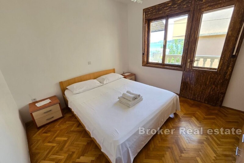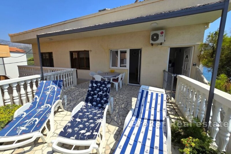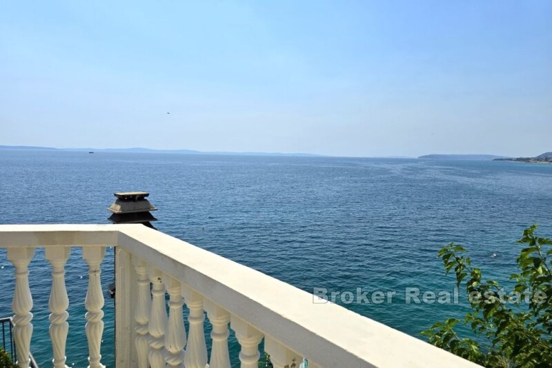 House in the first row to the sea, located in a popular neighborhood near Split. This semi-detached property consists of a basement, ground floor, and first floor. The basement houses a garage for multiple cars, while the ground floor features an apartment with three bedrooms, a living room connected to the kitchen, and a bathroom. The first floor includes a kitchen with a dining area, two bedrooms, and a bathroom. The ground floor requires a higher level of renovation compared to the first floor, which is successfully used for tourist purposes. Each apartment has its own spacious terrace with stunning and unobstructed sea views. The house has direct access to a stone beach and is within walking distance of amenities such as shops, bakeries, restaurants, cafes, and a post office. This property, with additional investments, is made extremely attractive by its first-row location to the sea and proximity to all essential amenities, offering great potential for both year-round living and tourist business.