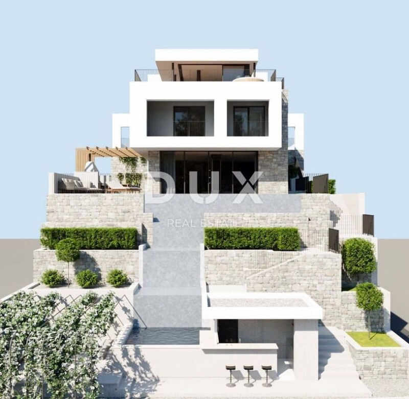 OPATIJA - luxurious modern villa 300m2 with pool and sea view + landscaped garden 650m2 Smart Villa in Opatija - this modern luxury villa that we offer for sale is located in beautiful Opatija, only 200 m from the sea, marina and beach. Located on a cascading terrain, on a plot of 670 m, the villa offers an enchanting view of the sea and the Kvarner islands. The villa exudes elegance and a harmonious interior and exterior. The living area of the villa is 300m2 and is spread over three floors. The decoration of the villa is divided into 3 zones: entertainment zone, day zone and lounge zone. This modern luxury villa that we offer for sale is located in beautiful Opatija, only 200 m away from the sea and the beach. Located on a cascading terrain, on a plot of 670 m, the villa offers an enchanting view of the sea and the Kvarner islands. The villa exudes elegance and a harmonious interior and exterior. Characteristics of the smart villa: The living area is located on the ground and first floor. The ground floor consists of a living room, a kitchen, a dining room arranged according to the open space concept, a storage room and a bathroom with a shower. There is also one additional room that can be a study or an additional bedroom. The living room is dominated by a large glass wall that can be opened electrically, which provides a panoramic view from the living room. The outer part of the ground floor is dominated by a 30 m2 swimming pool with a counter-current swimming system and a sunbathing area. There is also a summer kitchen with outdoor dining. A large pool on the ground floor and a smaller pool in the basement are connected by a waterfall created by a system of pool technology that connects the two pools, which allows water to constantly circulate in the waterfall. On the first floor there is a master bedroom with a bathroom and a terrace. There are two more bedrooms, each with its own bathroom, and one has its own terrace. At the top of the villa there is a lounge area with a whirlpool, which is thermally sealed with glass walls and can be used both in summer and winter. A designer fireplace gives a special atmosphere especially in the winter months. In the summer months, this space can be an open terrace equipped with comfortable armchairs and a sofa. In that zone there is also a separate bathroom, a small kitchen, a bar and a sun deck. In the basement of the villa, there is an additional space equipped with an audio-visual system and a heating-cooling system that can be used as an entertainment area, a cinema hall, a wine cellar or a storage room. The villa has an integrated KNX Smart home system. Smart houses offer the following advantages compared to conventional homes: energy savings, remote space management and control, security, increase in real estate value, comfort and lifestyle. All systems of the villa (heating-cooling, electrical system, audio-visual system, sensor alarm, video surveillance, smart house system, which systems cover all the rooms of the villa) are integrated into one control source; KNX system. The villa's equipment and installations will be from renowned Italian manufacturers. So the doors will be Barausse, eletro system, lamps and other Groppi and Viabizzuno, tiles, showers, REXA bathtubs. The exterior joinery and glass walls will be Heroal. The villa has 4 parking spaces and a charging station for electric vehicles. They paid a lot of attention to the interior decoration of the villa, but also to the overall development of the construction project, paying attention to every detail. Thanks to the impressive equipment, in this smart villa everyone will find something for themselves, whether they are athletes, business people or lovers of film and music, because the future owner and his guests have at their disposal all the necessary facilities for entertainment and relaxation from the fast pace of modern life . The plot is completely surrounded by a stone wall that provides peace, intimacy and shelter from prying eyes. Certainly a beautiful property for a luxurious family life, but also suitable as an investment in the form of elite tourism. This property is 220m from the sea as the crow flies, or 650m on foot (7 min). OPATIJA: Opatija, a beautiful coastal town located on the Adriatic Sea, is a famous tourist destination for tourists from all over the world. The city is surrounded by beautiful nature, at the foot of the Učka mountain. Real estate in Opatija offers a priceless view of the sea and the surrounding islands of Krk and Cres. Opatija is surrounded by charming small towns with old houses located in narrow streets rich in history. The streets of the city of Opatija are made up of properties that stand out with their specific architecture and villas that date from the Habsburg period. A large selection of beaches, crystal clear sea and various tourist services are the key factors that make Opatija a perfect tourist destination recognized by neighboring countries as an excellent investment choice. Real estate prices in this area are rising, rental occupancy is excellent, which has resulted in a return on investment of 5% to 10% and attracting foreign investors. Dear clients, the agency commission is charged in accordance with the general business conditions: www.dux-nekretnine.hr/opci-uvjeti-poslovanja Patrik Hrštić Agent s licencom E- www.dux-opatija.com Denis Kaštelan Agent s licencom E- www.dux-opatija.com OPATIJA - luxurious modern villa 300m2 with pool and sea view + landscaped garden 650m2.