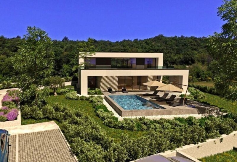 New complex of modern design villas with swimming pool in Labin area, 5 km from the sea! Villas benefit distant sea views! Total area of typical villa is 265 sq.m. Land plot is 817 sq.m. The property is characterized by a convenient location, quality of construction and modern design, which is characterized by a regular geometric form and regular lines in the space, as well as a modern interior of harmoniously arranged rooms and an airy space divided into two floors. The ground floor consists of an open concept space that unites the living room, dining room and kitchen with access to the terrace. The floor plan of the ground floor is complemented by a bedroom with its own bathroom, a guest toilet and a technical room. The first floor consists of two bedrooms with private bathrooms and terraces. Complete harmony and comfort has been achieved with a minimalist garden that contains a swimming pool of 24 sq.m. with a sun deck. The location, structure and comfort make this property an ideal opportunity for a peaceful family life as well as an investment for the purpose of tourist rental. The stated price refers to the turnkey phase. The planned completion of the works and handover of the property is expected at the end of 2024. Ref: RE-U-25067Overall additional expenses borne by the Buyer of real estate in Croatia are around 7% of property cost in total, which includes: property transfer tax (3% of property value), agency/brokerage commission (3%+VAT on commission), advocate fee (cca 1%), notary fee, court registration fee and official certified translation expenses. Agency/brokerage agreement is signed prior to visiting properties.