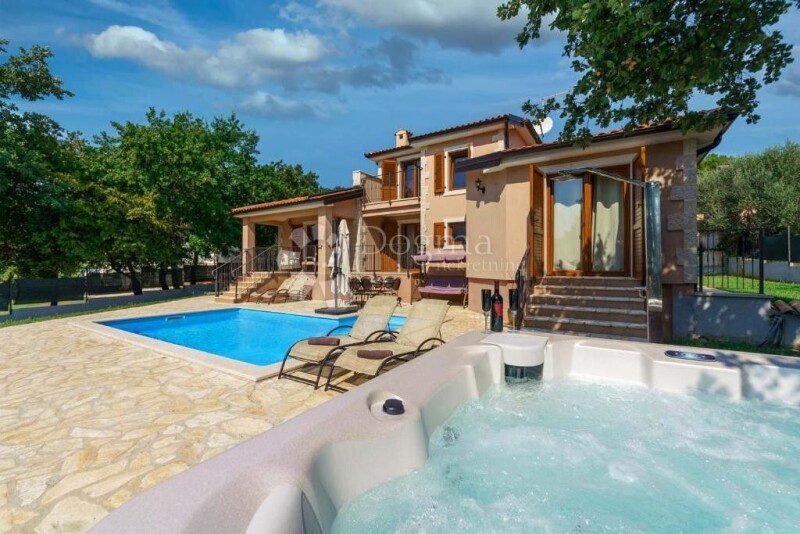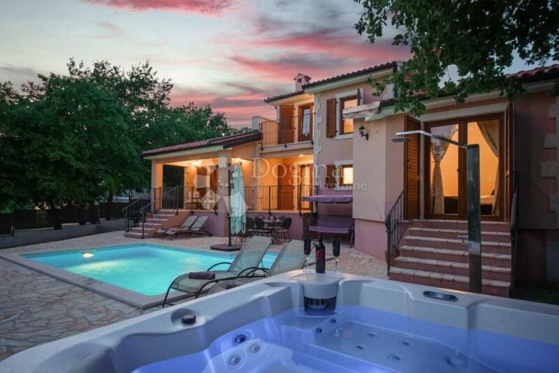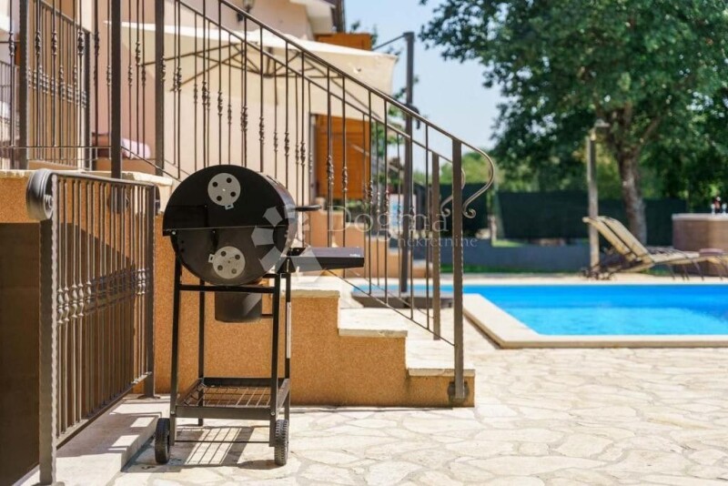 Near the town of Poreč, one of the most important tourist meccas of the indented coast of Istria, is this beautiful house with a swimming pool. Surrounded by an oak forest and a view of the olive grove and fields of friendly hosts. With an area of 165m2 spread over two fully air-conditioned floors, you can see the elegant taste in interior decoration at every step. On the ground floor there is a spacious living room with a fireplace and leather furniture with access to the pool beach, then one bedroom with a bathroom and access to the terrace, a guest toilet, a fully equipped elegant kitchen with a dining area. On the first floor there are two more bedrooms with a shared bathroom, one of the rooms has access to a balcony with an open view of the greenery that surrounds the house. The fully landscaped and maintained garden offers complete privacy, contains 3 parking spaces, a children's playground, a whirlpool for 5 people, a barbecue and outdoor dining area, and a 24m2 swimming pool next to the beach. 5 Daikin air conditioners are also used for heating/cooling purposes. The property is secluded and is truly the perfect combination of peace and a quick return to the hustle and bustle of content. An extremely rare opportunity for anyone looking for a quick return on investment in an established tourist rental business! Located in the heart of the western coast of the peninsula, the city of Poreč was, along with Pula, the first Roman colony in Istria. To this day, it preserves the beautiful ancient layout of the streets that stretch in the old part of the city. The Euphrasian Basilica is one of the best-preserved historical monuments in the world. It boasts a centuries-old tradition in hospitality, multiple awards in various categories, with a handful of events and sports activities, it will intrigue your curiosity! For any additional information and/or viewing, contact with confidence a licensed real estate agent with many years of experience in real estate transactions: LORENA KOGEJ Licensed agent Mobile 091/738-7200 Telephone 052/639-276 lorena.kogej@dogma-nekretnine.com.
