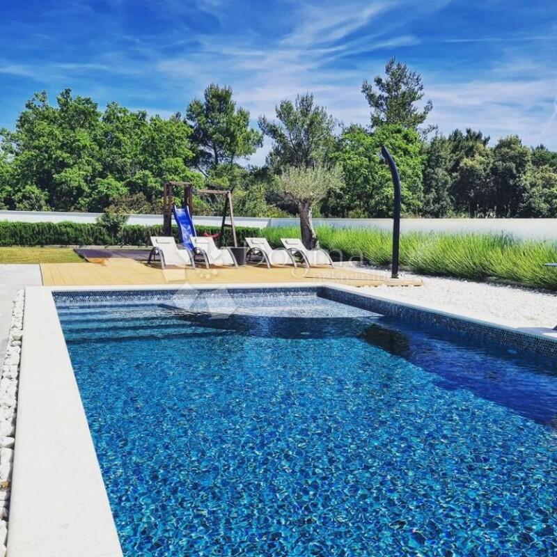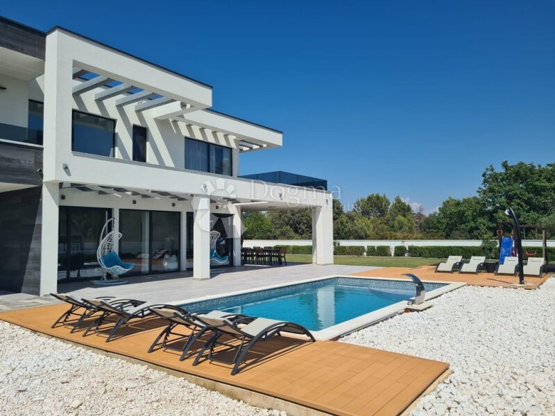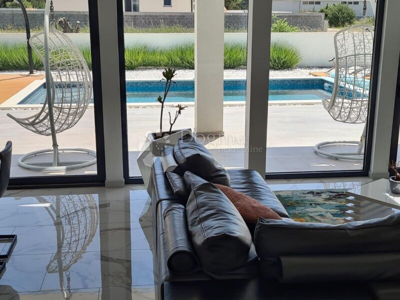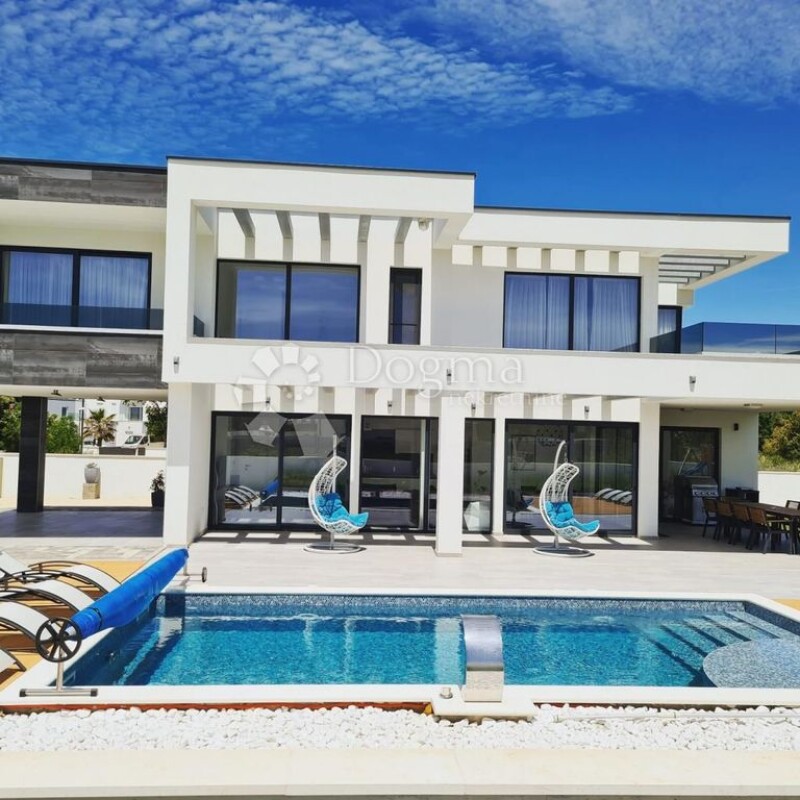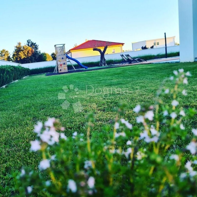 In the small tourist town of Zaton, located between the two historic cities of Zadar and Nin, we offer a luxury villa with a swimming pool. It consists of ground and first floor. On the ground floor there is an open space kitchen with a dining room and a living room, a bedroom with a bathroom, a toilet, a storage room, and an exit to a covered terrace with a view of the swimming pool and sunbathing area. There is also a covered area on the ground floor where you can park two cars out of a total of five parking spaces. The total area of the ground floor is 161.70 m2. We climb upstairs via the internal staircase and there are three bedrooms, each with its own bathroom, and access to one covered and one uncovered terrace. The floor area is 114.80 m2. The total usable area of the house is 276.50 m2 built on a plot of 854 m2. The house was built in 2021 with a brick thermal block, it is protected by 10 cm thermal insulation, aluminum joinery and security doors, and it has an energy certificate with an A rating. The floors are covered with high-quality ceramics and there is a floor heating system throughout the villa (except in the WC). There are air conditioners in the living room, as well as in every room. The 32 m2 swimming pool is lined with mosaic, uses salt water, and is equipped with heating, a waterfall and counter-current swimming. In the garden there is also a corner for children: a swing, a slide and a climbing area. Complete furniture and equipment of this villa are included in the price. Due to its excellence and equipment, the villa can be rented throughout the year. This property represents an opportunity for investors, but also for families who want their own quiet corner of luxury in the heart of Dalmatia.