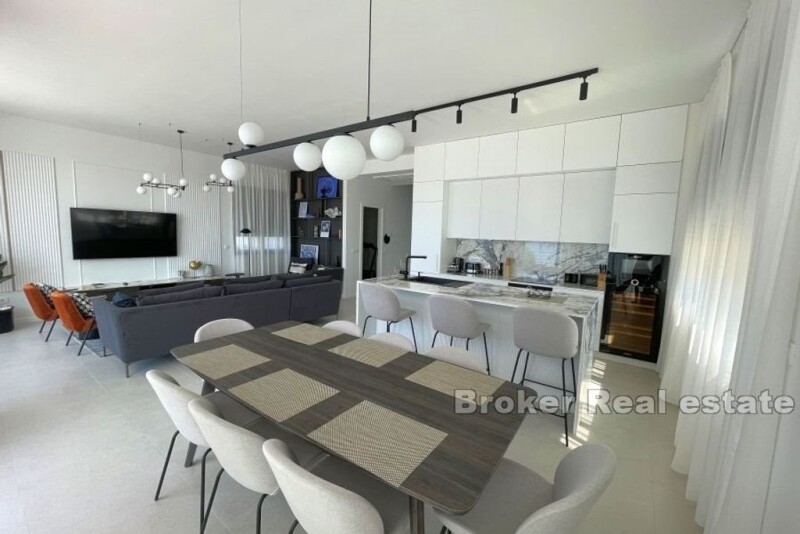 For sale is a luxurious villa with a panoramic view of the sea and islands, on Čiovo. Its 204 m² of living space is located on a plot of land of 425 m². All the rooms are spread over two floors, while the surroundings of the villa have facilities. On the ground floor there is a living area consisting of a kitchen, dining room and living room with a view of the sea and an exit to an uncovered terrace. On the same floor there is also a gym and one bedroom with its own bathroom. An internal staircase leads to the mezzanine where there are a toilet, a laundry room and a technical room. On the first floor, there are three more bedrooms with their own bathrooms, two of which have access to a covered balcony. A special detail is the glass wall in the bathroom belonging to the master bedroom, which offers a wonderful view of the sea. The entire facility is equipped with underfloor heating and air conditioning, and the villa is sold fully furnished and equipped. In addition to the swimming pool and sunbathing area, the villa also has a barbecue, a garden with Dalmatian horticulture, a lounge and outdoor parking spaces. All necessary facilities are located in the center of the town, while the airport is only 10 km away. Due to its close proximity to the beach, the villa is an ideal solution for a family holiday.