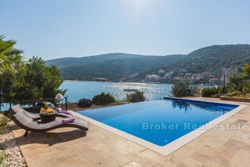 Five stars, stylishly decorated, modern villa with amazing sea views and a fabulously positioned infinity pool. This beautiful seafront family villa has something for everyone. Blessed with superb sea views, It is a newly built villa incorporating all the necessary elements for a successful holiday home: clean lines, spacious and airy rooms, lots of light, sauna, gym, infinity pool and lots of outdoor space for cooking, dining and relaxing. Most of the ground floor of Villa is given over to a large open-plan living-dining-kitchen area, with terracotta floor tiles and a series of French windows that communicate with the outside areas. Also on the ground floor is sauna with shower room and a guest toilet. After climbing a few stairs, one arrives at the first floor, where two en-suite double bedrooms are located. The first floor is also home to a small gym room with multifunctional exercise machine, exercise bike and orbitrek. Top floor features three more bedrooms, of which two have en-suite bathrooms. Villa is surrounded by a series of south-facing terraces, complete with lounge and dining areas. Sea views are amazing, especially from the infinity pool, which will almost certainly end up being the focal point of your holiday!.