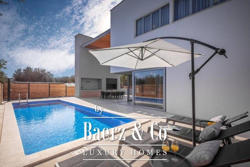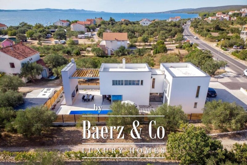 Near Biograd, in a picturesque small town, there is a spectacular villa that fulfills the wishes of even the most demanding customer. The house consists of two floors, spreads over 227 m2 and is designed as a house for rest, recreation and enjoyment. It consists of a ground floor with a beautifully furnished kitchen, dining room, spacious living room with fireplace and pool view, toilet and leisure room with sauna and gym. The upper floor is reached by a staircase of superior design. The upper floor is divided into two parts. Each part consists of a master bedroom, a small separate workspace and one double bedroom. Each room is equipped with a private bathroom with shower and one room next to the shower has its own bath. The villa's special offer includes a relaxation area with sauna, gym and shower. The courtyard of the villa is completely private and protected from view. It consists of a spacious outdoor kitchen with barbecue, dining room, swimming pool (35 m2), sun deck and climbing rock height of 6m. The house is 17 km away from Zadar Airport. Other information on request.