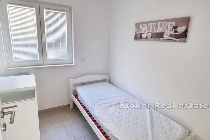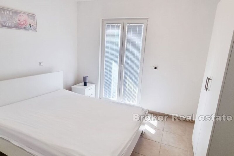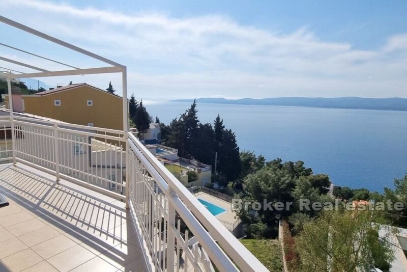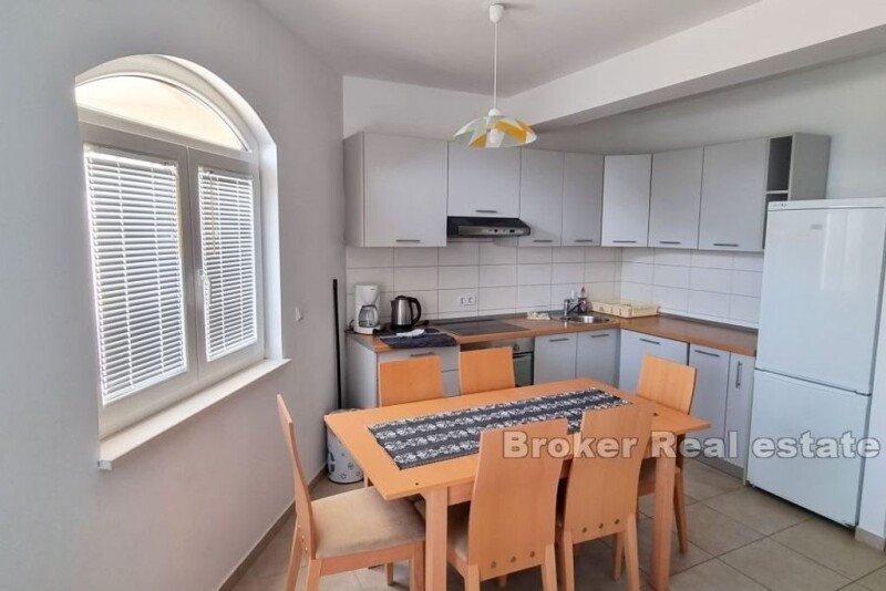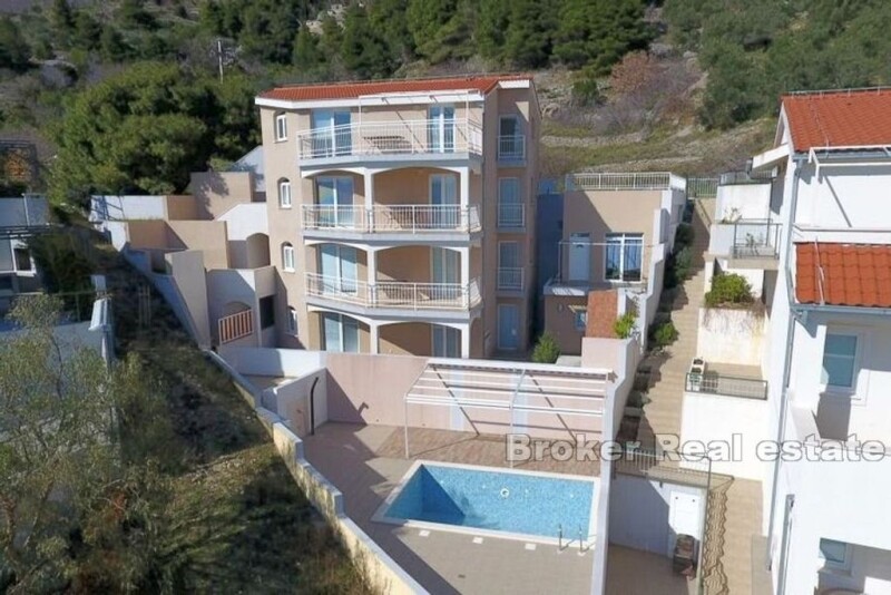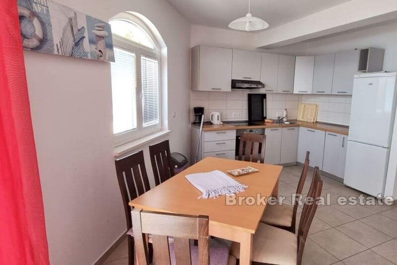 In the beautiful small town of Mimice, there is an elegant apartment house with a pool and a view of the sea. The property with a living area of 288 m2 is located on a plot of land of 550 m2. Arranged over four floors, the house is surrounded by a landscaped yard that guarantees privacy. Each floor is a separate apartment with a separate entrance. On the ground floor of the house there is an apartment of 72 m2 of living space. It consists of a kitchen and dining room, a living room, three bedrooms and two bathrooms and a storage room. The apartment has access to a large terrace on the ground floor with a view of the pool, the surrounding pine forest and the sea. All remaining apartments are identical. They contain 72 m2 of living space and consist of a kitchen and dining room, a living room, a bathroom, three bedrooms, a storage room and a terrace with a view of the sea. The spacious, landscaped garden offers complete peace and privacy. It contains a 6×4 m swimming pool with a view of the sea and the pine forest. All apartments are air-conditioned and fully equipped. An easy and pleasant access road leads to a parking lot sufficient for several cars. The location is outstanding. Located at a distance of 250 m from the sea, the house is located in a quiet neighborhood, far from crowds and noise. Considering the location, the property is suitable for both family life and tourist business. Shops and restaurants are a few minutes' drive from the house. In Mimic you will find everything you need for a perfect and relaxing family vacation. Without city crowds and noisy clubs, you can relax here with quiet restaurants, cafes and other amenities located right next to the beach. In addition to the white sand on the two city beaches, there are numerous coves and beaches in the area where you can find your own secluded corner. If you want a little more excitement, the cities of Omiš and Makarska are only a 20-minute drive away.