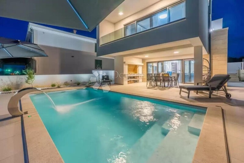 For sale is a luxurious villa in Zaton, modernly and designerly decorated and furnished with attention to every detail. Its garden, designed with the same precision, emphasizes functionality and comfort. Located in an extremely attractive and quiet location in Zaton, only 100 meters from the sea, this villa offers an enchanting view of the sea and the surrounding greenery from anywhere inside it - from the ground floor, through the upper floor to the roof terrace. The total area of this property is 520 m2, including 194.23 m2 of living space, 293 m2 of garden, a children's playground of 62 m2 and a 30 m2 swimming pool. The interior of the villa is spread over two levels. The ground floor contains a living room with a dining room and a kitchen fully equipped with all appliances and accessories, a toilet and a storage room. Large glass sliding walls allow access from the dining room and kitchen to a spacious covered terrace with a large barbecue, next to which there is a heated swimming pool equipped with deckchairs and umbrellas. The courtyard near the pool also offers an outdoor shower, while a separate children's playground is equipped with a soft floor to ensure safety during children's activities. A staircase lined with quality oak wood 4 cm thick leads to the first floor, where there are four comfortable bedrooms, each with its own bathroom. Two rooms have access to the balcony with a view of the sea and nature around the house. Each room has been designed with special attention to comfort and practicality, equipped with custom-made furniture, while the master bedroom has its own wardrobe. The villa also has a partially covered roof terrace of 64.53 m2, providing additional space for relaxing, sunbathing and enjoying the wonderful panoramic view of the surroundings. Underfloor heating and wall-mounted air conditioners for cooling ensure a comfortable temperature in all rooms. This property is extremely special not only because of its architecture and decoration, but also because of the unique location that offers access to two types of beaches - pebble and sandy, and the proximity of shops, public transport, ATMs, as well as two cities: Nin and Zadar, emphasizes the practicality of the location , making this villa a perfect combination of exclusivity and practicality. For additional information and questions, contact us at: Sonja Đurasek +385 95 582 5882.