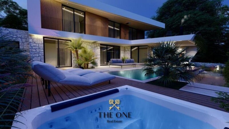 Luxury modern villa near Poreč is located in a wonderful green environment and is distributed over two floors and has 600 m2 of landscaped garden where you can enjoy the beautiful terrace and heated pool. The airy entrance hall leads to the living area of the villa, which is extremely spacious and consists of a kitchen that continues into the dining room and living room. The open concept of the living area continues unhindered through the large glass surfaces to the outside area. The covered summer kitchen is located right at the exit to the terrace, it is excellently equipped and there is a large dining table next to it. The outdoor space continues to the swimming pool surrounded by a sun deck with deck chairs. As a special addition, a “waterfall” flows into the pool from the upper terrace. Right next to the pool there is a jacuzzi and an outdoor shower. On the ground floor of the villa there is one en-suite bedroom, a guest toilet and a gym with a toilet, a storage room and a boiler room. An internal staircase leads to the first floor where there are three bedrooms, also each with its own bathroom and large glass doors leading to a spacious terrace. Large glass doors open a wonderful view of the surroundings, and thanks to them, the entire villa is flooded with natural light all day long. The villa has floor heating with electricity, heat pumps and air conditioning devices. The villa is equipped with video surveillance, security doors and an alarm system. Upon entering on the garden plot there is an outdoor parking lot for 5 cars. Top quality materials were used in the construction the villa. The planned completion of constraction is summer 2023. and is sold on turnkey bases, furniture excluded. Not what you’re looking for? Contact us for a personalized approach, and discreet, bespoke property finding service. THE ONE Real Estate E- www.theone.hr Luxury modern villa near Poreč.