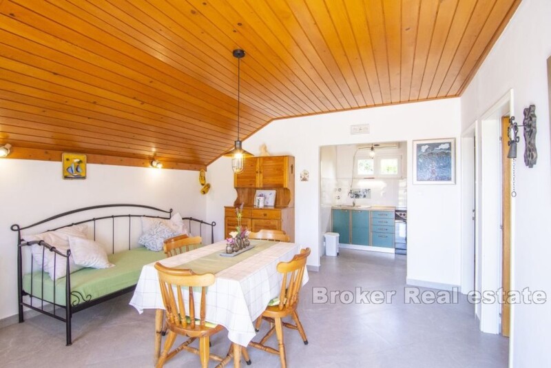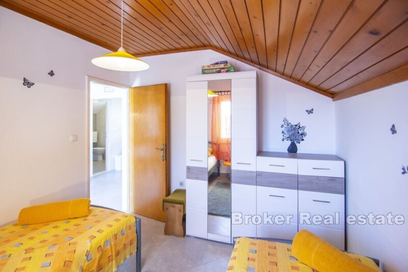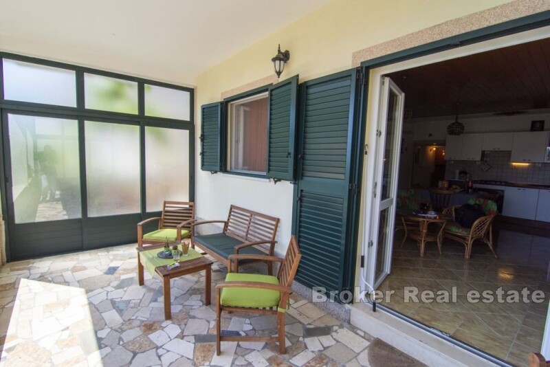 This beautiful house is located in an attractive location, in the second row from the sea, with an open view of the sea. With its total living area of 101 m², it is located on a plot of land of 475 m². The house is surrounded by a spacious garden, which is decorated with Mediterranean plants, which creates a pleasant environment for spending time outdoors. The house is spread over two floors. On the ground floor, there are two bedrooms, a bathroom, a kitchen with a dining room, and a living room with access to a large terrace. On the second floor there are also two bedrooms, a bathroom, a kitchen with a dining room and a living room with access to a terrace that offers a beautiful view of the sea. Next to the main house, there is also a detached building of 15 m² in which there is a studio apartment, ideal for guests or additional accommodation. One of the great advantages of this property is its own mooring for a boat in the port, and a 5 meter long boat that is included in the price. The house is only 30 meters from the sea and beaches on the western part of the island of Čiovo, which makes it an extremely attractive property for lovers of the sea and nature. The house is fully air-conditioned and has two parking spaces. Due to its location and proximity to all essential amenities, the house is ideal for year-round living as well as for renting for tourist purposes.