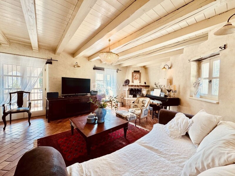 Istria, Tinjan, stone villa (new construction) in traditional Istrian style, living area 232 m2 with swimming pool. Plot area: 1,362 m2 A stone villa surrounded by greenery is located in a small town in the Municipality of Tinjan, near the Limski Canal (14 km), Vrsar (20 km), Rovinj (27 km) and Pula Airport (50 km, 50 min by highway). The yard is landscaped, it has a summer kitchen, swimming pool with salt water and Jacuzzi, surface area 40 m2, heated by central oil heating. The pool is currently being expanded and will be larger than the existing one in the picture. The villa consists of: - ground floor: kitchen and dining room (19.26 m2), laundry room (2.73 m2), toilet (2.10 m2), spacious living room (31.63 m2), bedroom (16.60 m2) with its own bathroom (4.48 m2) - floor: bedroom (16.60 m2) with bathroom (4.48 m2), master bedroom (24.43 m2) with bathroom (6.81 m2) and a spacious terrace with an external staircase connecting it to the yard. Central heating with heating oil via radiators and on the floor in the living room. The villa is designed in a designer style, with quality furniture, and is being sold as such. For more additional information, feel free to contact us. Želimir Bagić Agent s licencom E- New traditional villa Tinjan, 232 m2 with pool.