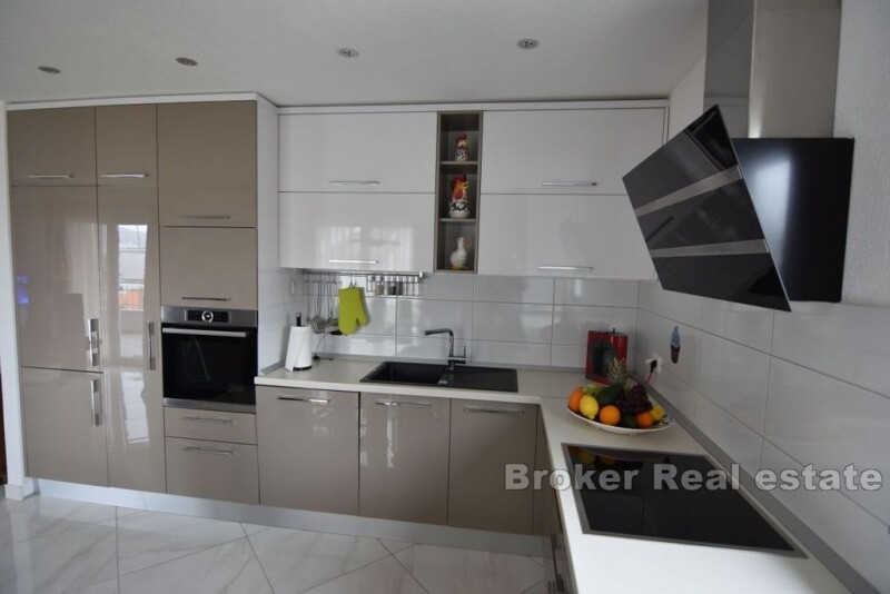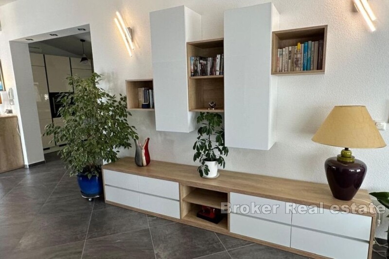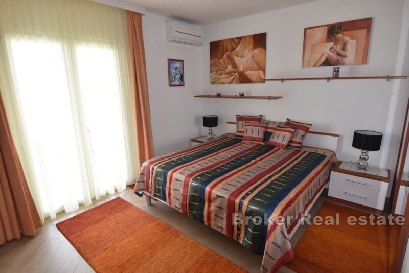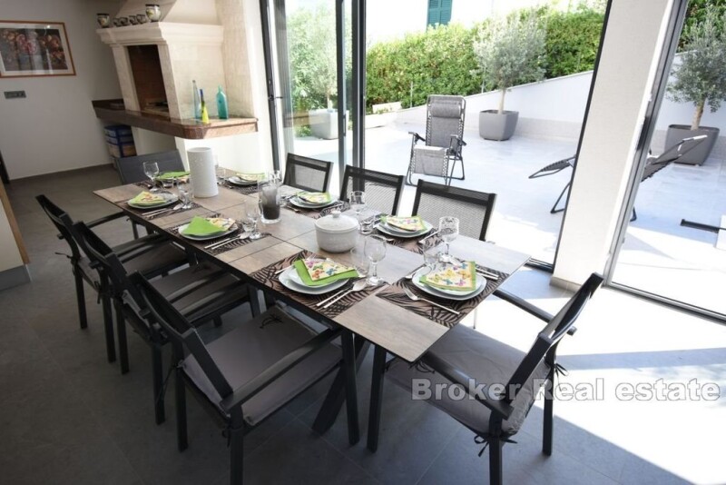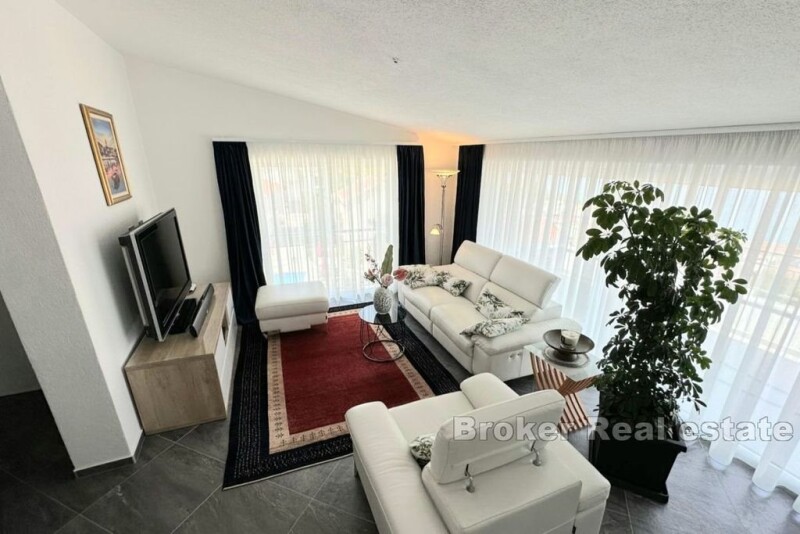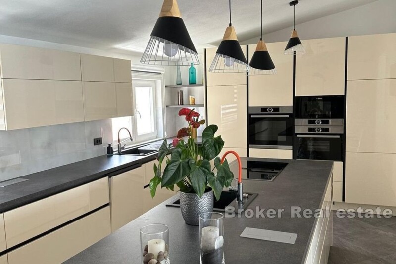 An exceptional house for sale located in a quiet bay on the island of Čiovo. The total living area of 540 m2 extends over 4 floors. The basement consists of a large storage room that future owners can convert as they wish, a garage and a bathroom. On the ground floor there is a spacious apartment consisting of an entrance hall, a large kitchen with a dining room, a living room, two bedrooms, one of which has a separate bathroom, two bathrooms, a storage room and a covered terrace that is great for spending time with friends and family. An internal staircase leads to the first floor, where there is a smaller apartment and the first floor of a two-story penthouse. The apartment consists of a hallway, sunny living room, kitchen and dining room, two bedrooms and two bathrooms. Also on the first floor there are two bedrooms and a bathroom of a two-story penthouse. The apartment continues on the second floor, which consists of an open space with a living room and dining room, a large kitchen, a pantry, a bathroom and a bedroom. The large covered terrace offers a beautiful panoramic view of the sea. The yard is fenced, so you can enjoy complete privacy here. The house has a corpo morto – an anchor block for tying a ship, which adds a unique maritime touch and thereby further emphasizes the property's coastal charm. Thanks to the proximity of the sea and all the necessary facilities, it is a real estate ideal for year-round living with the potential to be used for tourist purposes as well.