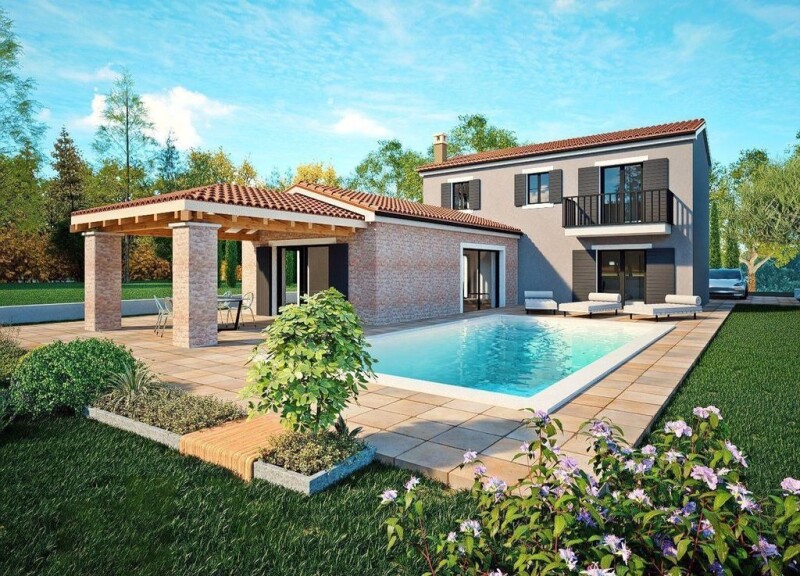New villa in Poreč, 7 km from the sea, with distant sea views! Total surface is 159 sq.m. Land plot is 606 sq.m. Poreč is much more than just a summer destination for sun and sea—it's a city designed with people in mind. A city where there is a constant drive to improve living conditions and progress in various areas. Poreč is a pleasant, safe, and well-organized place to live, where everyone can find their place. It's a city without surtax, with a strong social awareness for all generations. Not far from the city of Poreč, close to all amenities needed for year-round living, a house with a pool is available for sale. In addition to its location, which offers complete comfort, the property stands out for its quality construction, ensuring long-term satisfaction and a high standard of living. The house, featuring timeless architecture and partially clad in stone with rustic shutters, is designed as a single residential unit spread over two levels: the ground floor and the upper floor. The ground floor consists of an open-concept space that combines the kitchen, dining area, and living room, with access to a covered terrace, a bedroom with an en-suite bathroom, a guest toilet, and a utility room. The upper floor has two bedrooms, each with its own bathroom. One of the bedrooms opens onto a balcony with views of the sea and surrounding area. The yard is tastefully landscaped and fenced, featuring a 32 m² pool with a sunbathing area and parking spaces. With its location, design, and comfort, this property is an ideal opportunity for peaceful family living as well as a successful tourist rental. Ref: RE-U-30109Overall additional expenses borne by the Buyer of real estate in Croatia are around 7% of property cost in total, which includes: property transfer tax (3% of property value), agency/brokerage commission (3%+VAT on commission), advocate fee (cca 1%), notary fee, court registration fee and official certified translation expenses. Agency/brokerage agreement is signed prior to visiting properties.