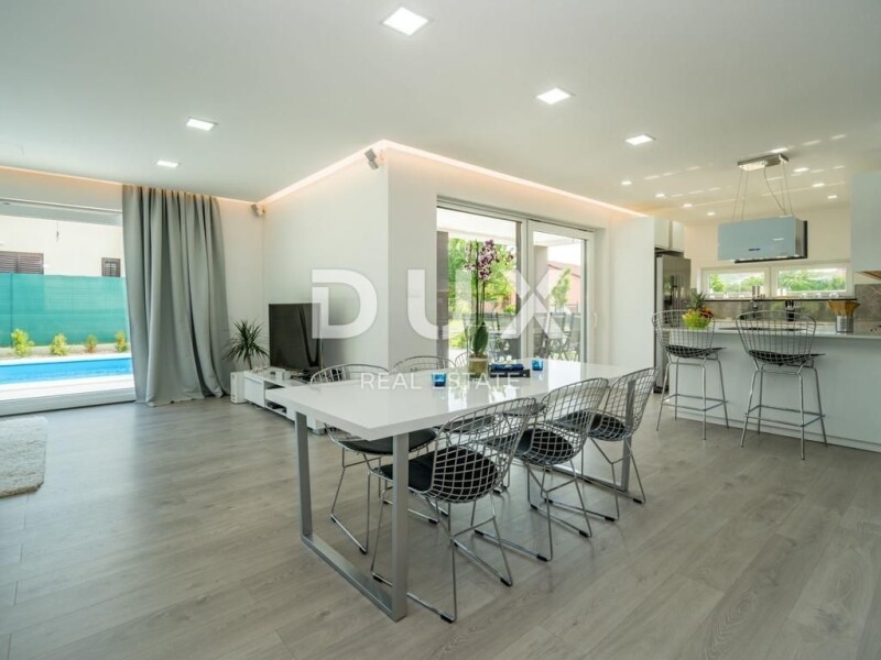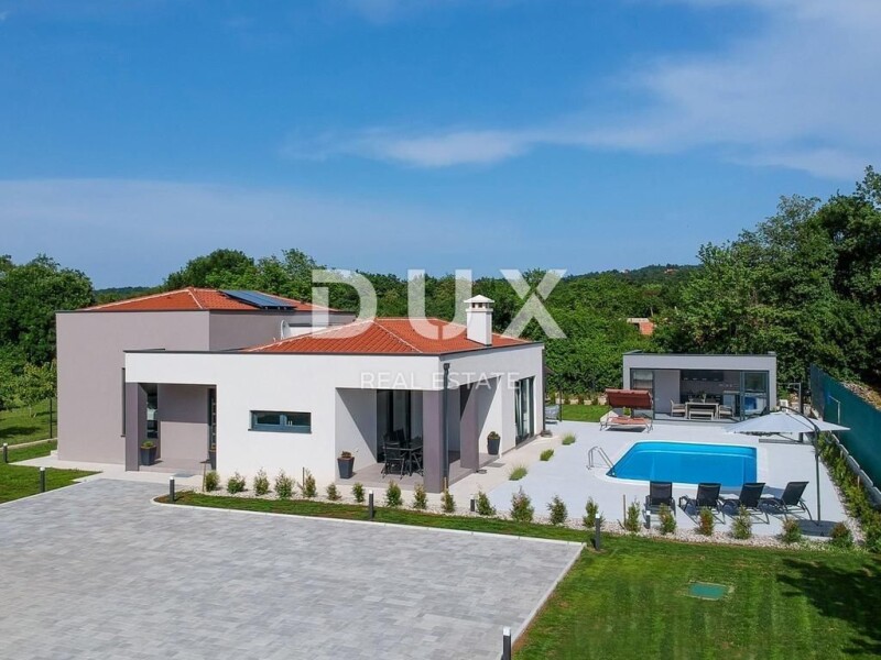 ISTRIA, LABIN - Luxury villa with pool near Labin The small town of Labin is located on the east coast of Istria, on a hill 320 meters high, only three kilometers from the sea. It was already inhabited in the second millennium BC. The old town is full of artistic charm and studios, which are best visited in the summer during the two-month festival of culture and art – Labin Art Republic. No less interesting are Labin's monuments and buildings, such as the town lodge, numerous palaces and the church tower from the 17th century - the highest point of the town, which offers a spectacular view of Rabac and the Kvarner Bay. The cycling paths in the vicinity of Labin will introduce you to the natural beauty, wine roads, history and ancient legends of this region. The nearby Rabac beaches with pearl pebbles and crystal clear sea are famous as the most beautiful in Istria. And restaurants, taverns and agritourisms provide a unique gastronomic experience on the beautiful east coast of Istria. A beautiful villa of modern construction with an area of 176 m2, located in a quiet settlement near Labin on a plot of 1225 m2. The villa consists of a living room, fully equipped kitchen and dining room open space concept, toilet, three bedrooms. Each bedroom has its own bathroom, and one also has a walk-in closet. There is a 32 m2 heated swimming pool with salt water in the garden, a sun deck, a children's playground, an auxiliary building with a summer kitchen, another toilet and a storage room. The yard is completely fenced and has several parking spaces. When decorating the villa, attention was paid to every detail, it is modernly decorated, quality materials are used and it is equipped with modern led, touch and wireless technology. The villa is sold fully furnished. A very interesting property located just a few minutes' drive from the city center and 5 km to the first beaches. Dear clients, the agency commission is charged in accordance with the General Terms and Conditions. Tina Širol Agent s licencom E- www.dux-istra.com ISTRIA, LABIN - Luxury villa with pool near Labin.