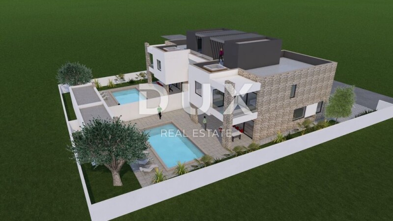 ZADAR, ZUKVE - Spacious semi-detached house with swimming pool! New construction! B. For sale is a modern semi-detached house in a beautiful location, only 310 meters from the sea, ideal for enjoying luxury and privacy. Each unit has its own swimming pool and yard, the building is under construction, with planned completion by summer. On the ground floor there is a spacious living room filled with natural light, an elegant dining room and a modern kitchen, with an additional toilet. There is also a bedroom with its own bathroom, a storage room and a covered terrace leading to the yard with a swimming pool, ideal for relaxing and socializing. An internal staircase leads to the first floor, where there are four bedrooms and four bathrooms. Two rooms have their own bathrooms, while all four rooms have access to terraces offering a beautiful view. This semi-detached house also has a spacious roof terrace, a perfect place to relax, where the installation of a sauna and jacuzzi is planned. The building has been carefully designed to provide maximum comfort: underfloor heating on the ground floor, air conditioning throughout, video surveillance for additional security and high-quality construction materials. The house has four stars, which guarantees a top quality of life. In addition, there are five parking spaces available. The purchase price in the current unfinished phase is €450,000. This property combines modern design, functionality and proximity to the sea, creating the perfect place to relax or live. Contact us and secure your opportunity to enjoy this exceptional property! Dear clients, the agency commission is charged in accordance with the General Terms and Conditions. Josip Šestan Agent s licencom E- www.dux-dalmacija.com ZADAR, ZUKVE - Spacious semi-detached house with pool! New construction! B.