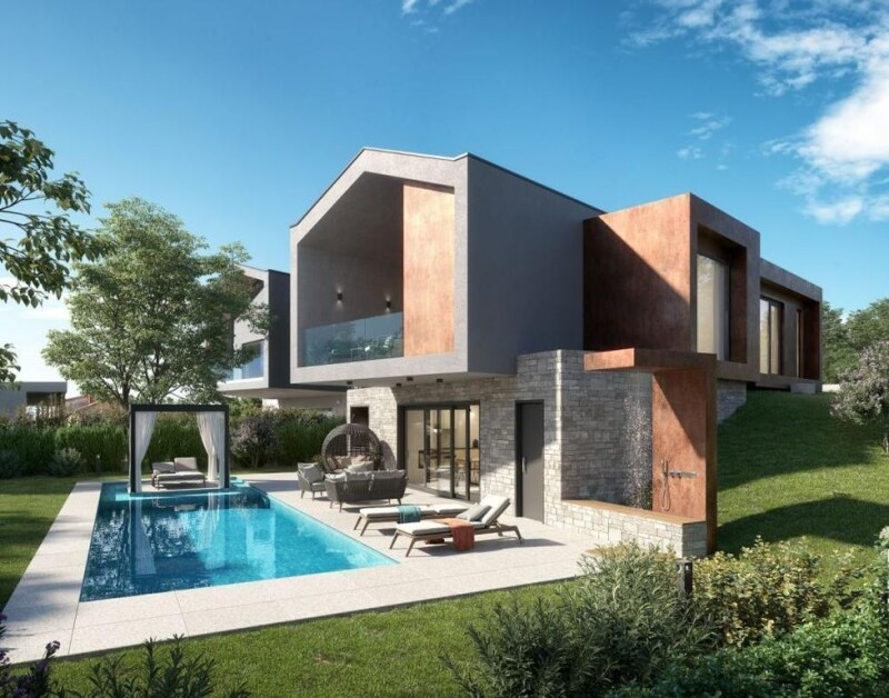 Extravagant designer villa with swimming pool in Poreč outskirts, with distant sea views! Porec has recently become a luxurious hotspot of Istria surrounded by a circle of older villages, which became modern villas agglomerations. This villa belongs to one of them. It combines ultra-modern design, barn style, panoramic glazing, loft elements in a turbulence of eclectics. The villa of 200 m2 includes a ground floor and first floor. On the ground floor there is an open space concept of living room, dining room and kitchen, toilet, pantry and room for appliances. The upper floor offers four bedrooms, three bathrooms, a relaxation room with spa and wellness area (sauna and jacuzzi) and two terraces. The luxury design villa is equipped with underfloor heating on a heat pump. In the landscaped garden of 873 sq.m. there is a summer kitchen and a heated pool of 56 m2 with sun deck area. This attractively designed villa is perfect for a luxurious holiday and relaxation or family life. By the end of 2024- The house is under the roof, carpentry has been installed and installations are spread around the house. The screed is being installed next week.The swimmuing pool and the beach around the pool were also built. Ref: RE-U-13785Overall additional expenses borne by the Buyer of real estate in Croatia are around 7% of property cost in total, which includes: property transfer tax (3% of property value), agency/brokerage commission (3%+VAT on commission), advocate fee (cca 1%), notary fee, court registration fee and official certified translation expenses. Agency/brokerage agreement is signed prior to visiting properties.