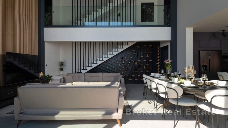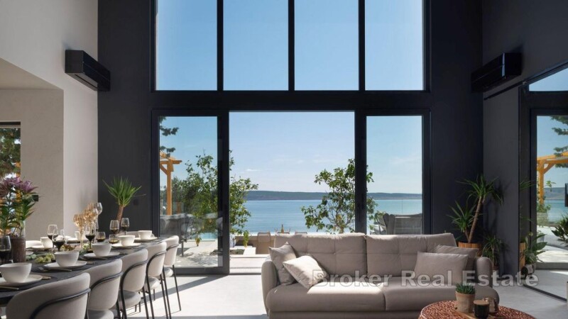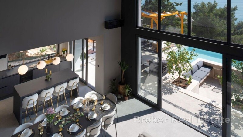 Newly built villa with pool and open sea view located in the northwestern part of Zadar County. The property with a living area of 250m2 was built in 2022 on a plot of 515m2 and spreads over three floors. The ground floor has an open kitchen concept with dining area, living room, pantry, sauna, jacuzzi and one bathroom. An internal staircase leads to the first floor consisting of two bedrooms with attached bathrooms and a gallery. The rooms have access to the balcony from which it is provided impressive sea view. On the third floor there are four bedrooms with attached bathrooms. The glass walls in the rooms allow a view of the sea from inside the room. In the landscaped garden there is a swimming pool, summer kitchen and a covered terrace with outdoor furniture. It has several parking spaces. At 26km distance from Zadar, and 100m away from the sea, and close to the necessary facilities for living. One of the advantages of the property is the attractive location that connects the mountain and the sea, the Mediterranean with a mountain climate, which makes it an ideal choice for a residential solution.
