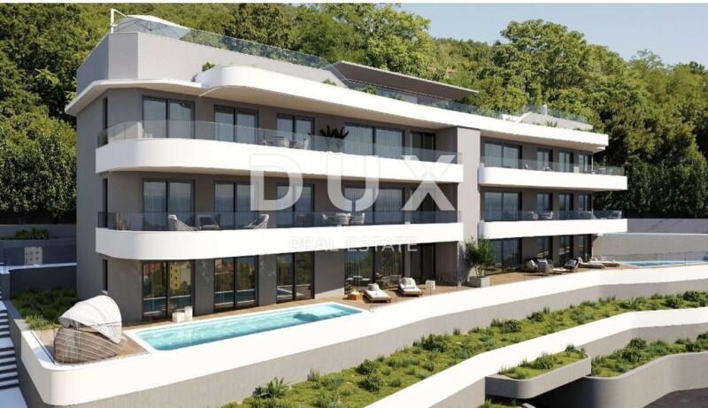 OPATIJA, CENTER - apartment 159m2 in a superb new building with its own pool, panoramic sea view, garage. In the quality DUX offer, we highlight a special new building by well-known investors in the very center of Opatija. It is an imposing new building of interesting design with its own swimming pools and a shared garage. The building is divided into 7 residential units, 4 of which have their own pool. Apartment A1 on the first floor, size 210m2, net 159m2, has an excellent open layout and consists of a hallway, a large open space kitchen + dining room + living room of up to 50m2, three bedrooms, two large bathrooms and a toilet. The terrace is 38m2 in size and all the bedrooms are south-facing and open onto the same terrace. From its own terrace, the apartment communicates with its own heated swimming pool and sunbathing area, which also offers a beautiful view of the sea and the roofs of Opatija's villas. - Panoramic sea view - Secured 2 large garage spaces - OWN SWIMMING POOL - Elevator - Underfloor heating and heat pump for each apartment - Branded sanitary ware, schuco carpentry The building will be ready for occupancy at the end of 2024, and materials can still be chosen at this stage interior according to the client's taste. In addition to 2 garage spaces, the property also includes a separate internal storage room, which is excellently connected by an elevator in the building. The position of the building is fantastic, surrounded by greenery and an open view of the sea, yet a 5-minute walk slightly downhill to Lungomara and the first beaches. The drive to the center of Opatija takes only 60 seconds. A fantastic opportunity to secure a powerful apartment in a new building in the very center of Opatija. Marko Šutanovac Agent s licencom E- www.dux-opatija.com OPATIJA, CENTER - apartment in a top new building with its own pool, panoramic sea view, garage.