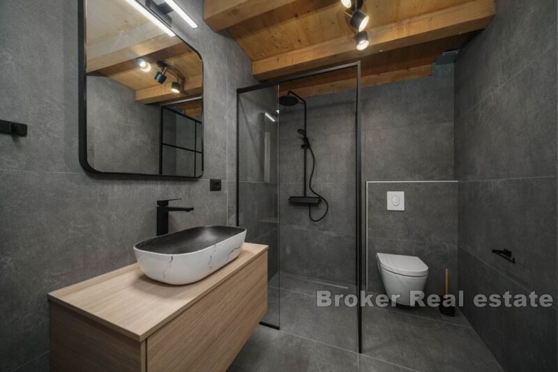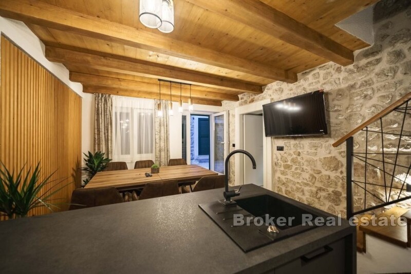 Stone House in the center of a small town, beautifully renovated, fully furnished, and ready to move in. Located just 40 meters from the waterfront, sea, restaurants, and cafes. The property consists of 3 floors connected by fairly spacious internal stairs and terraces on two levels. On the ground floor, there is a kitchen with a dining area and a room with its own walk-in closet and bathroom. The first floor functions as a living room and also includes a bedroom with a walk-in closet and bathroom. On the second floor, there is a third beautifully designed sleeping room, an additional bathroom, and a versatile space that can be used as a friendship area or converted into an extra sleeping room if needed. This area seamlessly connects to an inviting open terrace, where you can soak up the sun and enjoy the refreshing sea breeze. One of the terraces features a jacuzzi for endless enjoyment with a 360-degree view of the entire village. The house was renovated 2 years ago and is extremely well-equipped. The inter-floor construction is reinforced concrete slabs. The original stone interior walls have been largely preserved, giving the house charm and historical significance. The property is close to all amenities, near the sea, and close to restaurants and cafes.