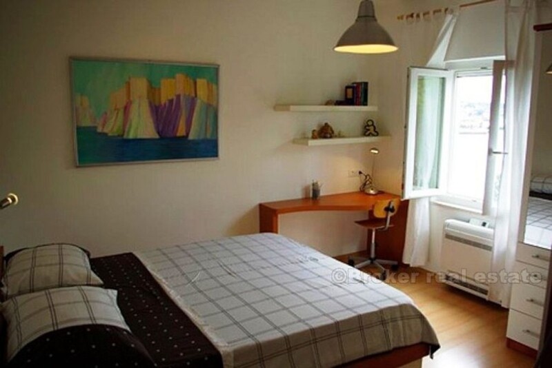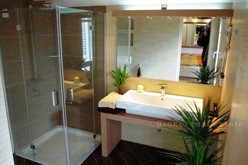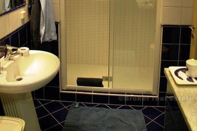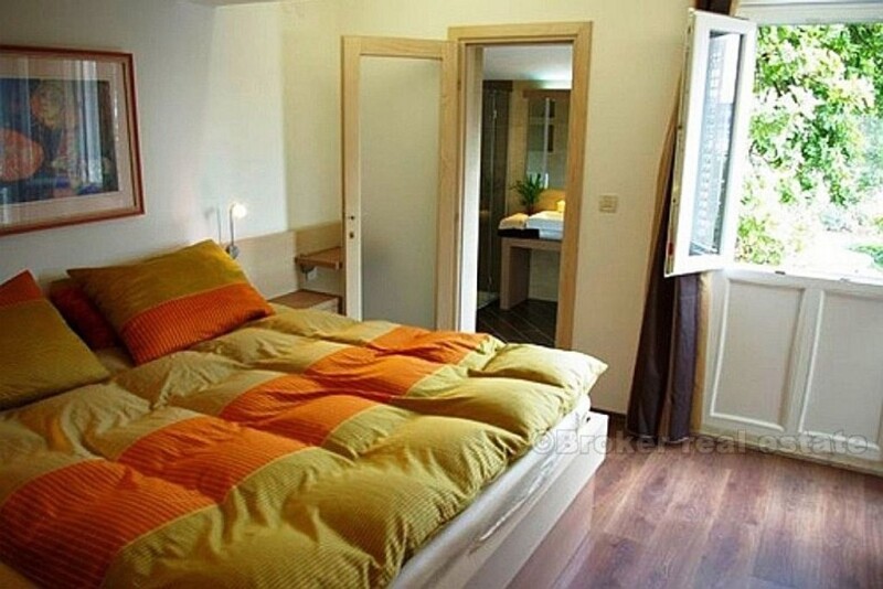A villa is placed on 4000- square-meter property with stone gardens, olive trees, orange trees, lemon trees, pine trees, and other Mediterranean plants. The Villa consists of 4 double bedrooms and 4 bathrooms, huge kitchen with a dinning room and living room equipped with 50” LCD, SAT TV. On the second floor there is a separate apartment which can be reached from the house, but also has a separate entrance from the garden. This apartment is a part of the villa and it consists of double bedroom, kitchen, living room with possibility to accommodate 2 persons, bathroom with jaccuzzi and dining room. The interior design is very modern, functional and equipped at high standards: Full air conditioning system, wireless internet access, SAT TV, there is also a big swimming pool and several sunbathing terraces. The gardens are lit during the night. One of the terraces is roofed and there is a summer kitchen with barbecue and dinning area for 12 persons. In front of the house there is a garage and parking for 4 cars.
