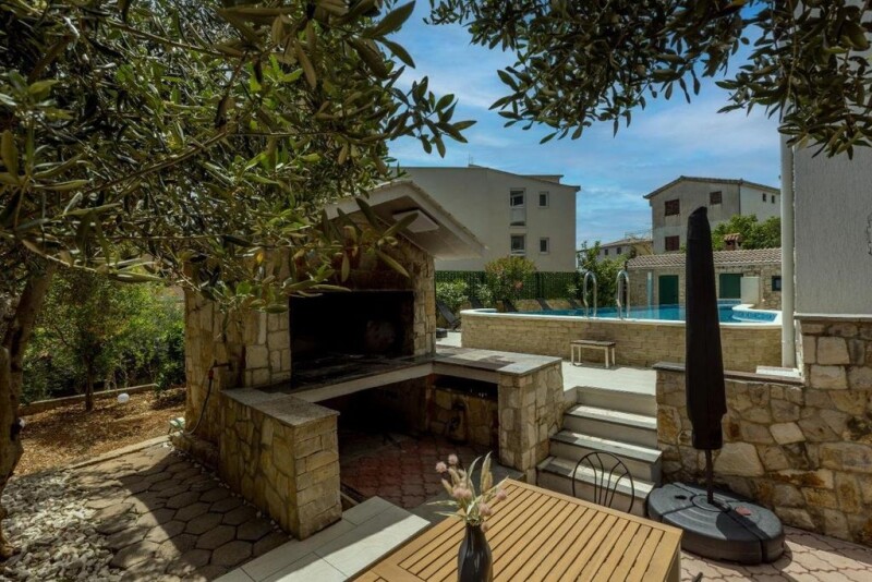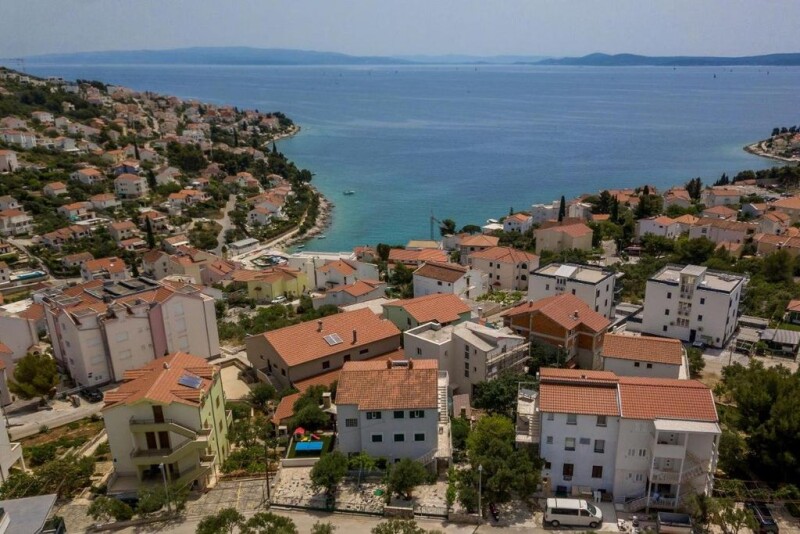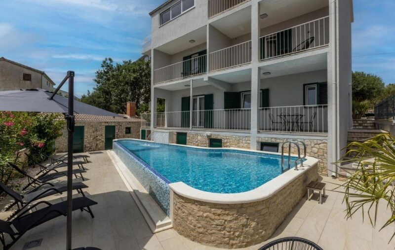 Location: Okrug Gornji Built: 2014 City center: 3.3 km Sea: 0.45 km Airport distance: 6 km Inside space: 240 m2 Plot size: 550 m2 Bedrooms: 5 Bathrooms: 5 Swimming pool: 36 m2 Parking: 3 Air-conditioner Sauna Cameras Patio Playground Garden.
