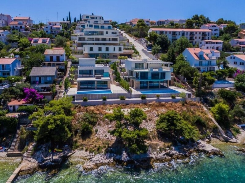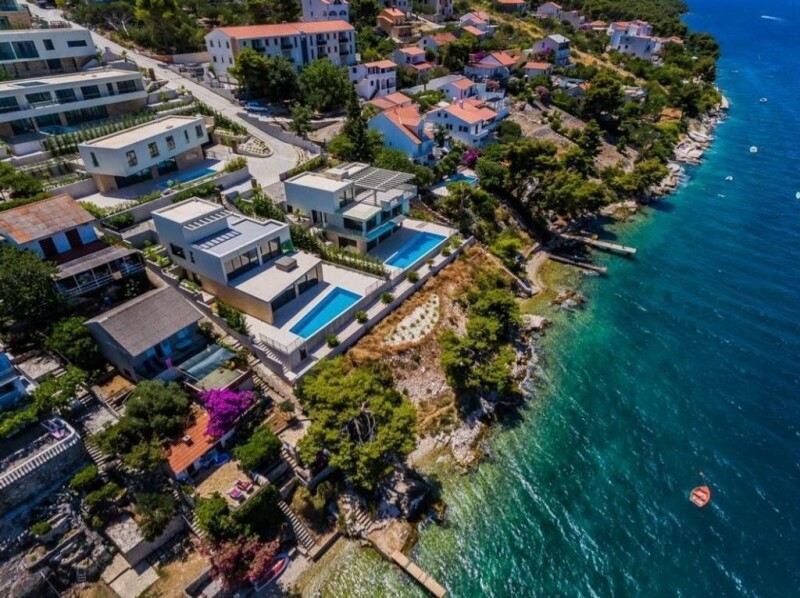 Wonderful villa just 90 meters from the sea within new modern villas community on Ciovo! Exceptional sea views and views over Trogir and Seget! Total area is 332 sq.m. Land plot is 698 sq.m. This exclusive villa also delights with its modern architecture and can acomodate at least 8 people. The three spacious terraces allow you to admire the incomparable view of the crystal-clear sea and the opposite coast. On the ground floor, you will find three bedrooms and bathrooms with direct access to the sun-drenched terrace and large heated swimming pool. You can get to the upper floor through the stairs. On the upper floor, apart from another bedroom, you will come across the impressive living-dining space with a total area of 100 m2, which offers an undisrupted, picturesque panoramic view, thanks to the extensive, glazed fronts and two terraces. The dining room in a cubical form is located above the ground floor, which is an eye-catching accent of the building’s architecture. The villa has been finished with top-class contemporary materials only. The 120x240 cm floor tiles made of the highest quality ceramic, along with the solid wood flooring, make this exclusive villa a perfect place to stay all-year-round. The interior doors equipped with hidden frames, along with the top-quality, sturdy aluminum glazing, perfectly complete the modern style of this unique villa. The marvelous greenery, choicely arranged to the needs of the residence, combined with the modern lighting, emphasizes the exceptional character of the structure. Spacious garage for one car is a pleasant bonus. Ref: RE-LB11021Overall additional expenses borne by the Buyer of real estate in Croatia are around 7% of property cost in total, which includes: property transfer tax (3% of property value), agency/brokerage commission (3%+VAT on commission), advocate fee (cca 1%), notary fee, court registration fee and official certified translation expenses. Agency/brokerage agreement is signed prior to visiting properties.