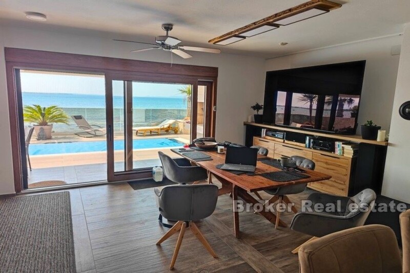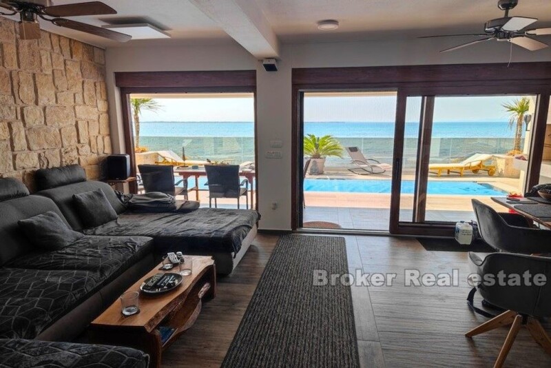 Zadar – new villa first row to the sea The villa was built in 2022 and is characterized by a modern exterior and interior. The villa is located in a quiet part of town, next to the beach, just a few steps to the sea. It extends over two floors – The ground floor consists of an entrance area, hallway, wardrobe, bathroom, toilet, kitchen and dining room, as well as a living room with large glass walls and direct access to the terrace where there is a swimming pool, sun deck and stone grill. -The floor, which is reached by a wide internal staircase of modern design, has three rooms, each with its own bathroom, all rooms have a view of the sea and an exit to the southern terrace. The villa is characterized by functionality and quality construction, with lots of sun and daylight in a position that guarantees a pleasant stay. Equipment includes: -Video surveillance -Floor heating via a heat pump -Electric underfloor heating – each room can be heated separately -Solar water heating (300l) -Pool with salt water (Electrolysis) – self-dosing – automatic flushing -Furniture made to measure – Italian porcelain ceramics – Home cinema with 85″ TV + Teufel Dolby Atmos + all rooms equipped with 55″ TV – Chimney (possibility of installing a fireplace) -4 air conditioners (cooling-heating) The villa has parking for +3 cars and a 20m2 basement Excellent micro and macro location of the villa, close to all amenities, shops and restaurants, historical and cultural sights, as well as close to the city of Zadar.