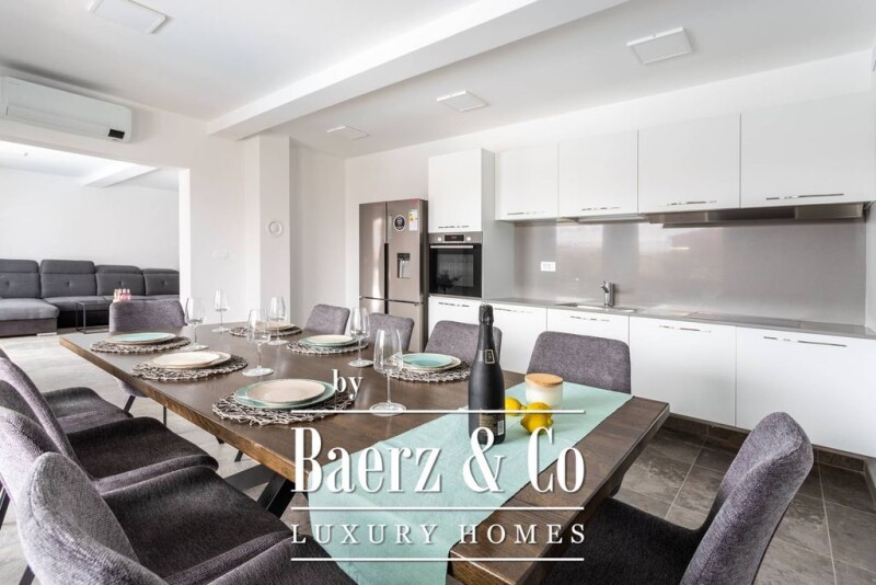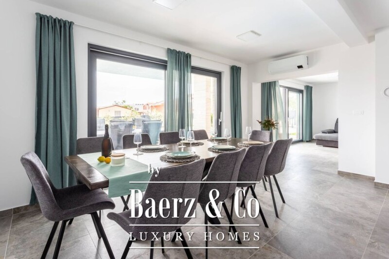 On the beautiful island of Vir, a few steps from the sea, there is a beautiful newly built villa with a swimming pool. The location, in addition to the landscaped beach and clean sea, offers peace and privacy. Thanks to the orientation, throughout the summer you can feel the freshness coming down from Velebit. Vir is one of the most visited areas on the Croatian coast, with one of the largest number of overnight stays, known for excellent private accommodations. The building is divided into three floors, with a total area of 300 m2. The ground floor consists of an entrance hall, a spacious living room, a kitchen with a dining room (both have direct access to the yard), a bathroom, and a bedroom with an attached bathroom (adapted for people with disabilities). On the first floor there are four bedrooms (two with terraces) with attached bathrooms. The basement is designed as a storage space and engine room. All rooms and the living area are equipped with air conditioners. The fenced and cultivated garden offers the future owners a covered area, a barbecue, and a 40 m2 swimming pool. For more information, feel free to contact me.