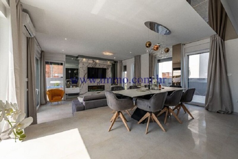 For sale is spacious villa on two floors, situated in quiet little town near Zadar. Nice beach is just few minuts away on foot. If you want a vacation without crowds, this is the ideal place. On the ground floor of the villa there is an open-concept kitchen, dining room, large living room with a fireplace and two guest toilets. This floor also includes a bedroom with an attached bathroom. From the living room, kitchen and bedroom, through the glass walls there is a sunny outdoor terrace with a swimming pool. Next to the pool is a sunbathing area and an outdoor shower. An internal staircase leads to the upper floor, which includes three comfortable bedrooms with lots of natural light. Each room has an en suite marble bathroom and a private covered terrace. This villa is surrounded by a wall and metal fence, which gives it privacy. The yard is well maintained and includes a barbecue with an outdoor dining area. Oleanders and Mediterranean plants are planted in the garden. Villa has four uncovered parking spaces. The best materials and the highest quality equipment were used during construction (PVC and ALU carpentry, marble, underfloor heating). The interior is equipped with beautiful designer furniture, lighting and attention to detail. Infrastructure: electricity, water, septic tank, paved access road. Additional information about the facility, its exact location and sightseeing is possible after signing a brokerage agreement with the agency that is in accordance with the Data Protection Act and the Real Estate Brokerage Act.