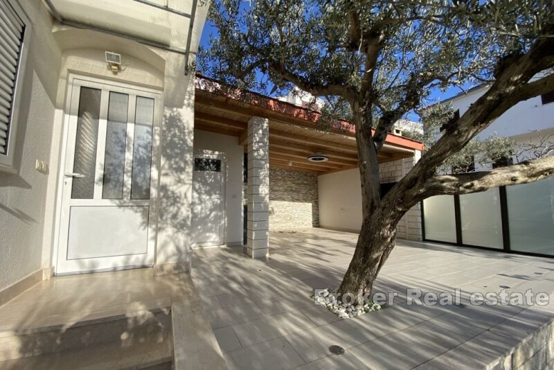 In a beautiful bay on the island of Čiovo, just 50 meters from the clear Adriatic Sea, is located this detached house with numerous amenities and complete equipment. The house consists of three floors: The ground floor includes a 30 m² garage and an additional fully furnished basement of 32 m², ideal for various purposes. The first and second floors consist of two residential floors, each with a three-room apartment, a spacious bathroom and a large terrace that provides maximum comfort. The first floor additionally has underfloor heating, which makes it comfortable to stay in even during the colder months. The apartments are fully decorated and furnished, and the house is sold in such condition, ready to move in. Solar panels are installed on the roof, while a 300-liter boiler provides hot water for the entire house. The spacious yard offers enough space to park 5-6 cars. In addition to parking, the garden is enriched with a furnished summer kitchen and barbecue – a perfect place for socializing and outdoor meals during summer evenings. The rest of the yard is planted with olive and citrus trees, which contributes to the Mediterranean atmosphere and natural beauty. This house, located in a peaceful environment and near the sea, offers excellent opportunities for family life, vacation or tourist investment.