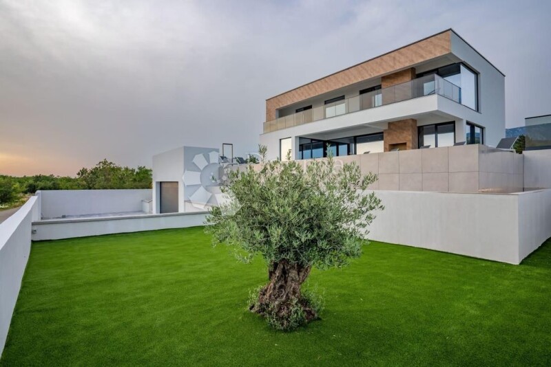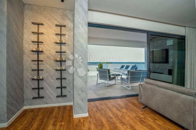 Crikvenica, Jadranovo: Luxury Newly Built Villa with Pool and Stunning Sea Views, Front Row to the Sea A modern and luxurious newly built villa with breathtaking panoramic views of Kvarner, the island of Krk, and the surrounding nature, located in an exceptionally beautiful location, front row to the sea (150m as the crow flies), just five minutes from beaches and picturesque seaside promenades. Situated on a 1270 m² plot, the villa spans three floors of beautifully and modernly designed interior spaces, with a total area of 396 m². The basement features a recreation and social room with a cinema hall, fitness-wellness area, toilet, laundry room, and utility room, connected to the other floors by an internal staircase. There is also a 38 m² garage for two cars (with an additional three parking spaces within the property). The ground floor consists of an entrance area, a bedroom with an en-suite bathroom, an additional guest toilet, an open space dining area, a kitchen with an island, and a living room that opens onto a covered terrace and an outdoor area enriched with a spacious garden, a large 55 m² infinity pool with a sunbathing area, a barbecue, and an outdoor living and dining area. An internal staircase leads to the first floor, where there are three spacious bedrooms, each with its own bathroom (two of which also have their own walk-in closets), and each has access to a balcony offering a stunning view of the sea and the island of Krk. A special ambiance in all rooms of this exceptional villa is provided by large glass walls that open the interior to numerous terraces (totaling 200 m²), all of which offer unobstructed views of the sea. Behind the house, there is a large open multifunctional space intended as an olive grove but can be arranged according to the buyer's wishes. This exclusive villa offers complete privacy and is a guaranteed good investment, whether as a family residence or as a rental investment opportunity, combining an exceptional location, modern architecture, high-quality materials, and top-notch execution. It features a facade of ventilated Roman travertine stone, underfloor heating, and Mitsubishi air conditioners in every room. It is fully equipped (with preparations for solar panels, a heated pool, and an electric car charging station). For all additional information, please call: LANA BLAŽEVIĆ Agent s licencom Mob 095/525-7325 Telefon 051 564 890 lana.blazevic@dogma-nekretnine.com.