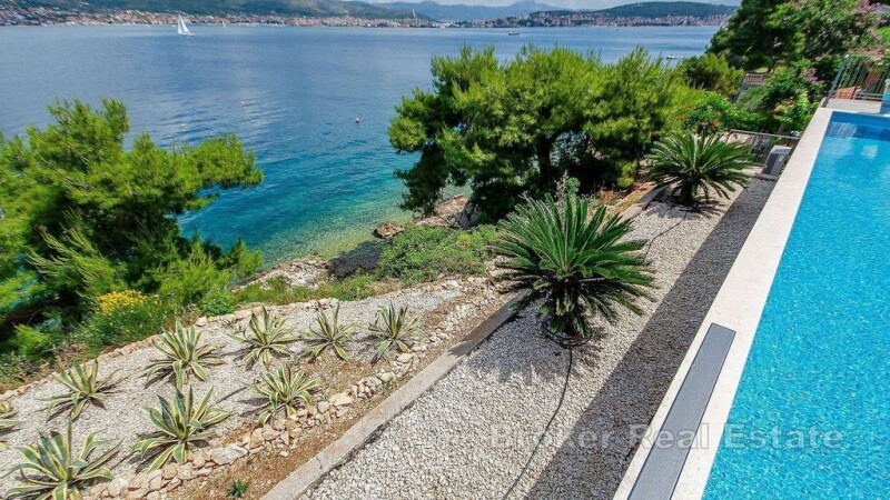 Newly built villa with pool located on the island of Ciovo, in the first row to the sea. The villa has a total living area of 349m2 and is located on a land with a total area of 700m2. It is spread over three floors built on a cascading terrain and from all floors there is a stunning open sea view. The first floor consists of two bedrooms, one of which has a bathroom, two bathrooms, pantry and open concept living room and kitchen with dining area of 84m2 with a large glass sliding wall leading to a spacious terrace. The terrace offers an open sea view, it has a lighted heated pool 11m long with sun deck and outdoor furniture, thanks to the floor-to-ceiling aluminum windows the enchanting open sea view stays in sight, even if you are standing in the living room. The elevator leads to the second floor where the laundry is located, three bedrooms with attached bathrooms, one bedroom with a large glass sliding wall has access to a spacious terrace with an outdoor dining area and jacuzzi and sun deck. On the third floor there is a garage for two parking spaces and another outdoor covered parking space. It is also possible to use each of the floors as a separate housing unit. The overall impression is completed by glass fences that enclose the terraces on all floors and the garden decorated with Mediterranean plants.
