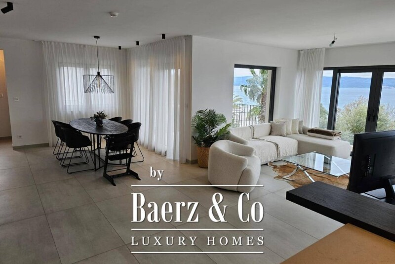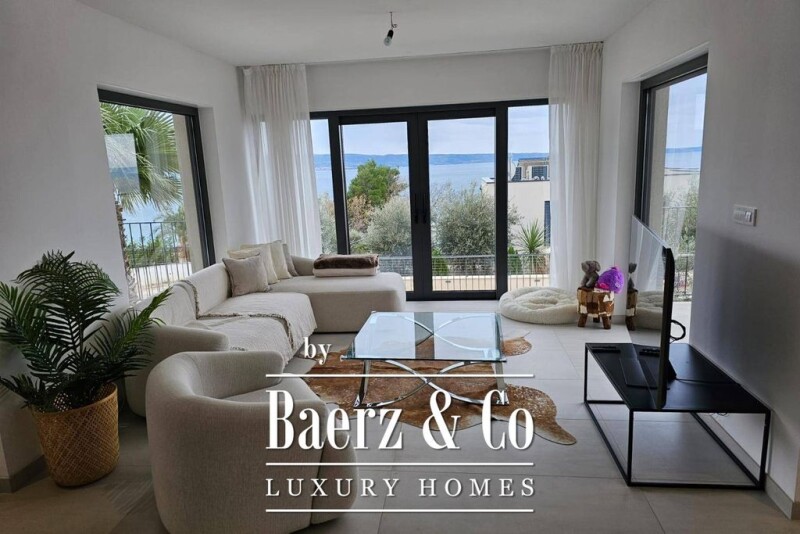 Podstrana, elegant villa with a swimming pool and panoramic sea views. With a modern design, high standard of construction quality, as well as the level of equipment, this villa is located on a hill with a beautiful panoramic sea view. Gross area of 190 m2, on a plot of 510 m2, located 400 m from the sea, and extends over two residential floors, a total of 182 m2 of closed living space, and with a large terrace in front of the building and an additional storage room and engine room. In front of the house there is a fenced driveway with parking for three cars. It consists of a ground floor and first floor, and a basement as a basement, and in front of the building there is a terrace with a swimming pool, sundeck and landscaped garden, then a fenced yard and parking in front of the building. It has 4 bedrooms, one of which is a master bedroom with a private bathroom, a large living room, an open-plan kitchen and dining room with access to a spacious terrace with a swimming pool and sundeck. The outdoor heated pool measures 8m x 4m and is 1.6m deep. The ground floor consists of a kitchen with a dining room and a spacious living room, a shared toilet with a bathroom and one smaller bedroom. In front of the building, with direct access from the living room, there is a large terrace with a swimming pool, an outdoor shower with hot water, a sunbathing area and a garden with palm trees, olive trees and indigenous plants. The garden has a self-watering system, a fireplace and a canopy with a retractable roof. On the first floor, on the south side, there are three spacious, comfortable bedrooms, one of which has its own bathroom, and a loggia on the south side with a beautiful panoramic view of the sea and the Bay of Brač. All rooms and rooms are air-conditioned with inverter air conditioners. High energy efficiency is ensured by a 10 cm thick polystyrene facade on the outside and 6 cm thick stone wool on the inside. The partition walls inside the building are Knauf boards and acoustic wool, which ensures superior sound insulation. A solar hot water system is located on the roof. All the windows are anthracite aluminum, triple-layered glass, automated shutters, high-quality stone inside and outside the building, a fence around the building, gutters in the facade.... Podstrana is a tourist resort, 5 km from Split and 28 km from the airport. Podstrana has all the facilities needed for a pleasant vacation, but also for everyday life: shops, restaurants, a pharmacy, a school, a playground... Sandy and pebble beaches stretch from Stobreč to Omiš, with which Podstrana is connected by a promenade along the sea. The building was built in 2021 and is properly maintained, and is being sold fully furnished and equipped. We are at your disposal for any additional information.