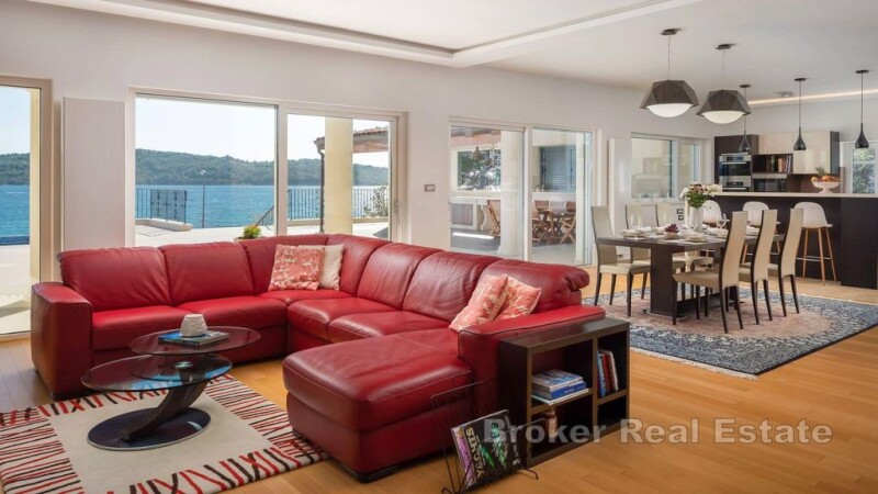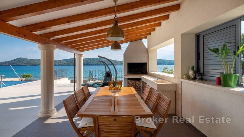 Luxury estate located in attractive location in the first row to the sea in Šibenik. The villa with a total living area of 1005 m2 is spread over two floors and is located on a plot of land of 2580 m2. The villa consists of seven bedrooms with attached bathrooms, a spacious kitchen with a dining room and a living room, two toilets, an indoor pool, a sauna, a fitness room and a room with entertainment content. The outdoor area is enriched with an infinity pool with a sun deck, an outdoor kitchen and an outdoor dining room. The spacious cultivated garden has direct access to the beach. The villa is located 700 m from the city center and 60 km from the airport. The advantage of the property is the walking distance from the beach and the spacious land that provides absolute privacy and peace.