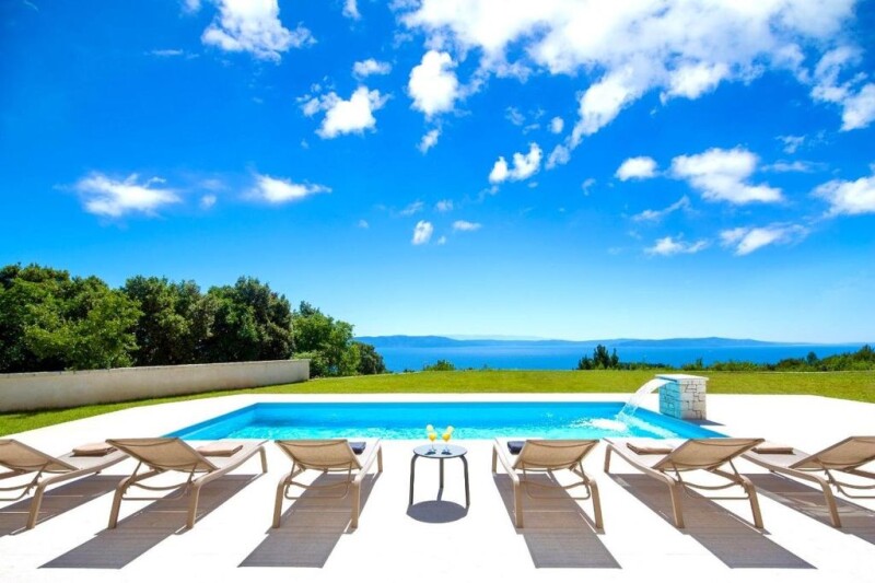 Location: Labin Built: 2018 City center: 15 km Sea: 0.95 km Airport distance: 24 km Inside space: 360 m2 Plot size: 1514 m2 Bedrooms: 4 Bathrooms: 4 Swimming pool: 50 m2 Parking: 5 Air-conditioner Cameras Patio Playground Garden.