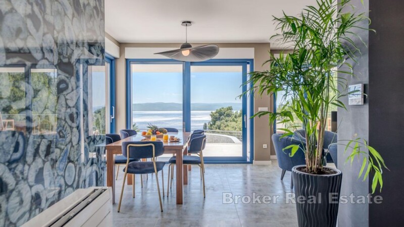 Newly built villa located near the town of Makarska, in a unique position with open sea view. Quality workmanship and selected materials provide a pleasant stay inside the villa as well as in its garden. The villa consists of a total of 400m2 spread over four floors. The ground floor has a bedroom with bathroom, kitchen, dining room and living room with access to the terrace. On the first floor there are three comfortable bedrooms with bathrooms and access to a balcony from which offers a view of the sea and islands. From the ground floor stairs lead to two floors in the basement which are used for relaxation indoors, especially in winter. On the first floor of the basement there is a gym, pool area, sauna and bathroom with access to the outdoor terrace connected to the outdoor pool. On the top floor of the basement is a large indoor pool and jacuzzi. Quality materials and equipment were used during the construction. The whole house is air conditioned and is sold fully furnished. In the fenced yard there is an outdoor heated pool, sun deck and barbecue with outdoor dining area. The villa has parking for several cars while on the side of the house there is an entrance to the garage for one vehicle. Given the location, the outdoor and indoor pool villa is great for tourist rentals in summer but also in winter. Note: The stated price is expressed in the net amount and does not include VAT for legal entities. If the future buyer is a natural person, the stated price will be increased by agreement.